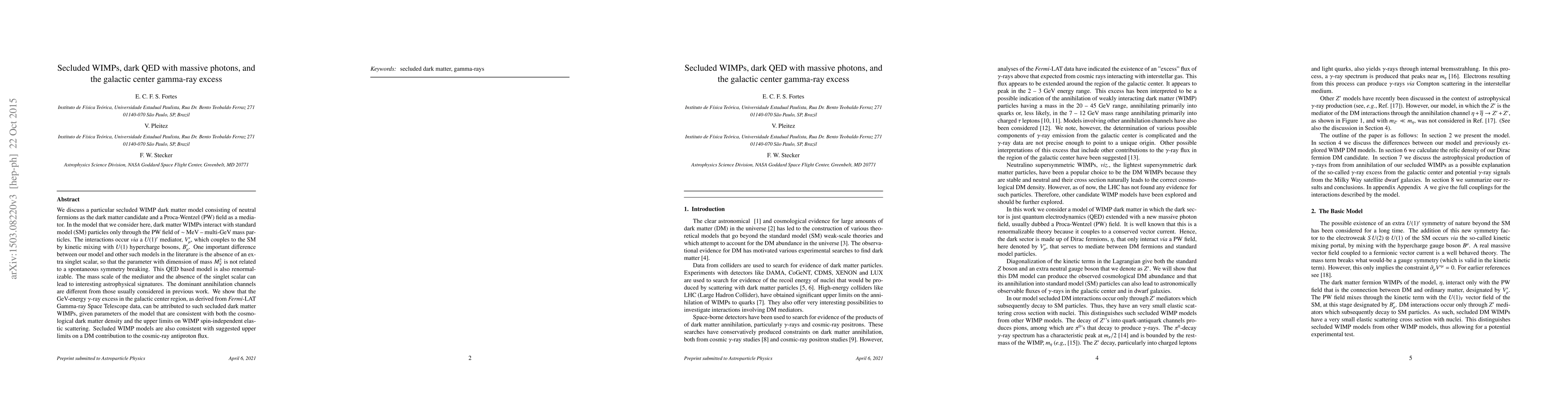 This paper proposes a secluded WIMP dark matter model with neutral fermions mediated by a Proca-Wentzel field, explaining the galactic center gamma-ray excess without an extra singlet scalar. The model's unique annihilation channels and mediator mass scale offer distinct astrophysical signatures.