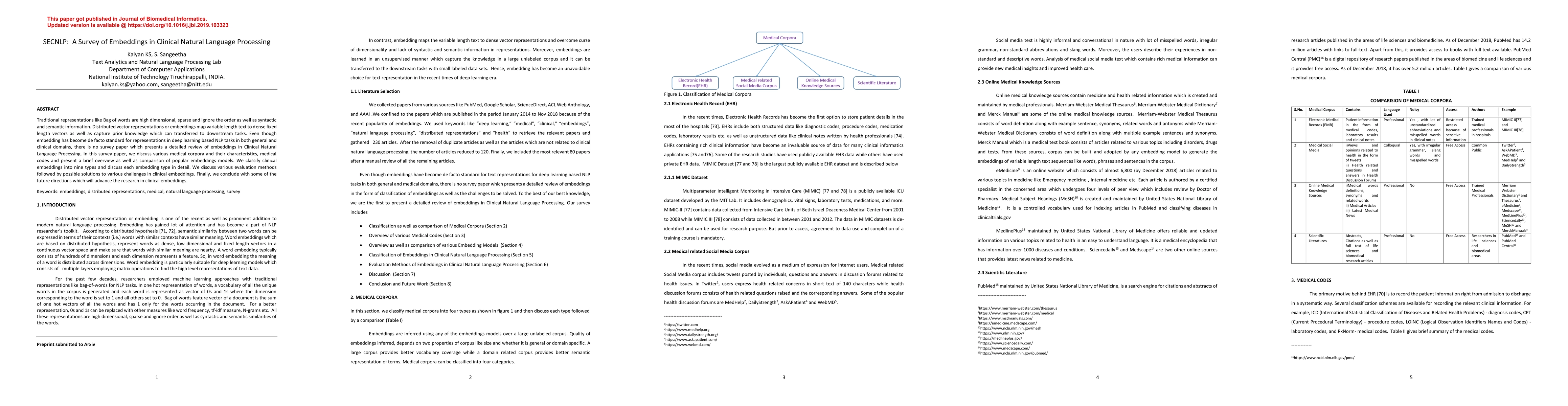 This survey paper discusses various medical corpora, their characteristics, medical codes, and presents a detailed review of embeddings in Clinical Natural Language Processing (CNLP). It categorizes clinical embeddings into nine types, evaluates different methods, and addresses challenges in clinical embeddings.