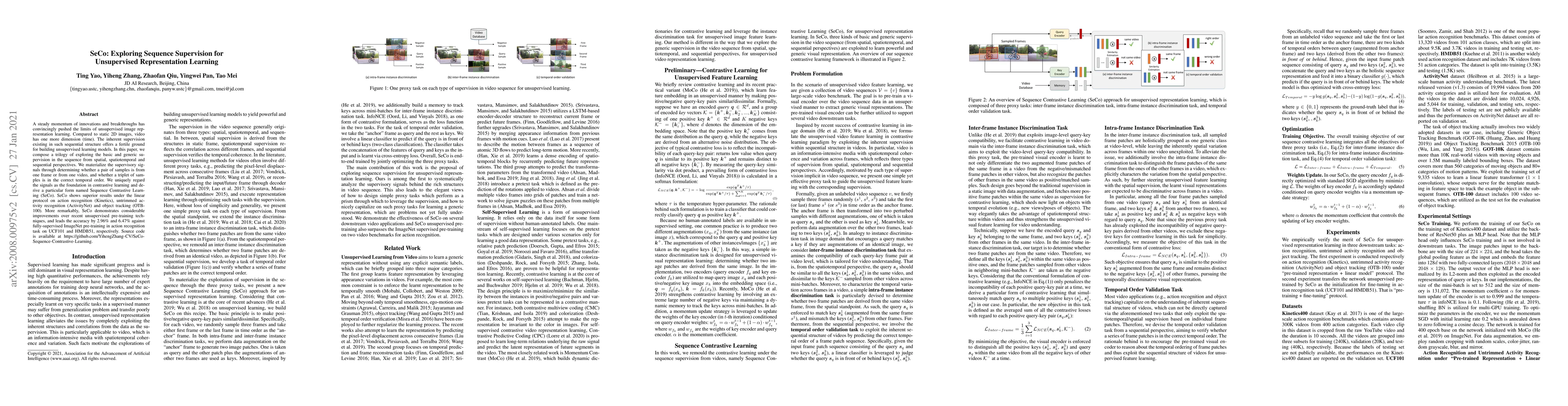 A steady momentum of innovations and breakthroughs has convincingly pushed the limits of unsupervised image representation learning. Compared to static 2D images, video has one more dimension (time). The inherent supervision existing in such sequential structure offers a fertile ground for building unsupervised learning models. In this paper, we compose a trilogy of exploring the basic and generic supervision in the sequence from spatial, spatiotemporal and sequential perspectives. We materialize the supervisory signals through determining whether a pair of samples is from one frame or from one video, and whether a triplet of samples is in the correct temporal order. We uniquely regard the signals as the foundation in contrastive learning and derive a particular form named Sequence Contrastive Learning (SeCo). SeCo shows superior results under the linear protocol on action recognition (Kinetics), untrimmed activity recognition (ActivityNet) and object tracking (OTB-100). More remarkably, SeCo demonstrates considerable improvements over recent unsupervised pre-training techniques, and leads the accuracy by 2.96% and 6.47% against fully-supervised ImageNet pre-training in action recognition task on UCF101 and HMDB51, respectively. Source code is available at \url{https://github.com/YihengZhang-CV/SeCo-Sequence-Contrastive-Learning}.