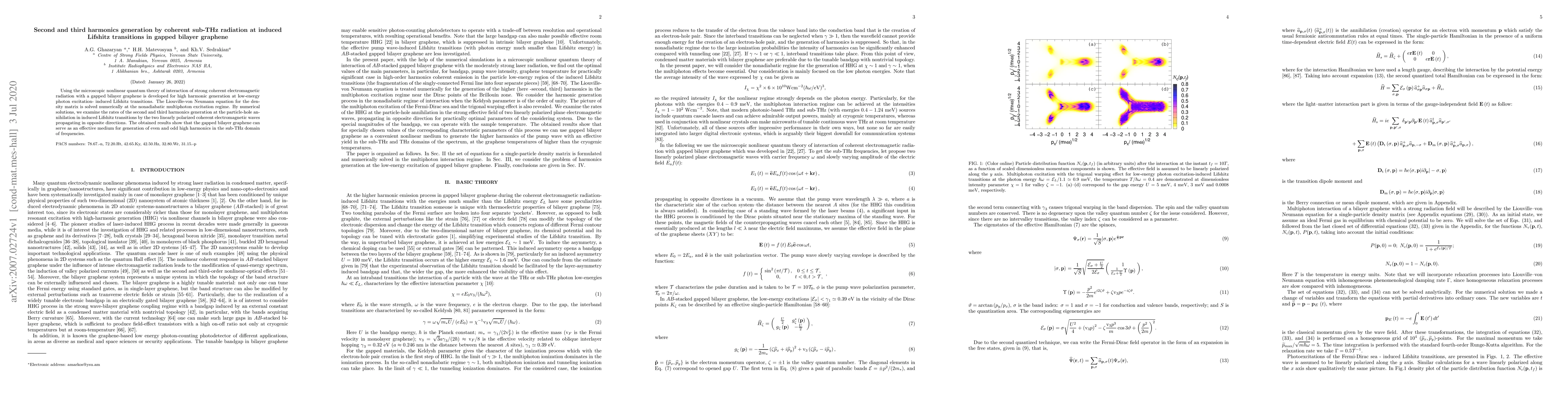 This research develops a microscopic quantum theory to study high harmonic generation in gapped bilayer graphene under coherent sub-THz radiation, focusing on Lifshitz transitions. Numerical solutions reveal the effective generation of second and third harmonics through particle-hole annihilation at these transitions, demonstrating graphene's potential as a medium for sub-THz harmonics.