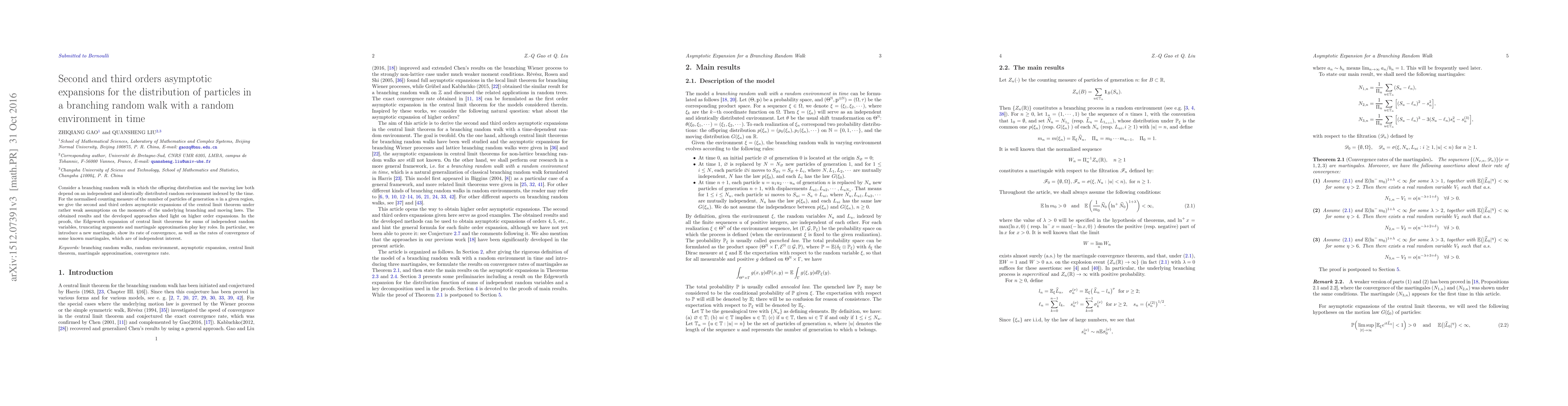 Consider a branching random walk in which the offspring distribution and the moving law both depend on an independent and identically distributed random environment indexed by the time.For the normalised counting measure of the number of particles of generation $n$ in a given region, we give the second and third orders asymptotic expansions of the central limit theorem under rather weak assumptions on the moments of the underlying branching and moving laws. The obtained results and the developed approaches shed light on higher order expansions. In the proofs, the Edgeworth expansion of central limit theorems for sums of independent random variables, truncating arguments and martingale approximation play key roles. In particular, we introduce a new martingale, show its rate of convergence, as well as the rates of convergence of some known martingales, which are of independent interest.