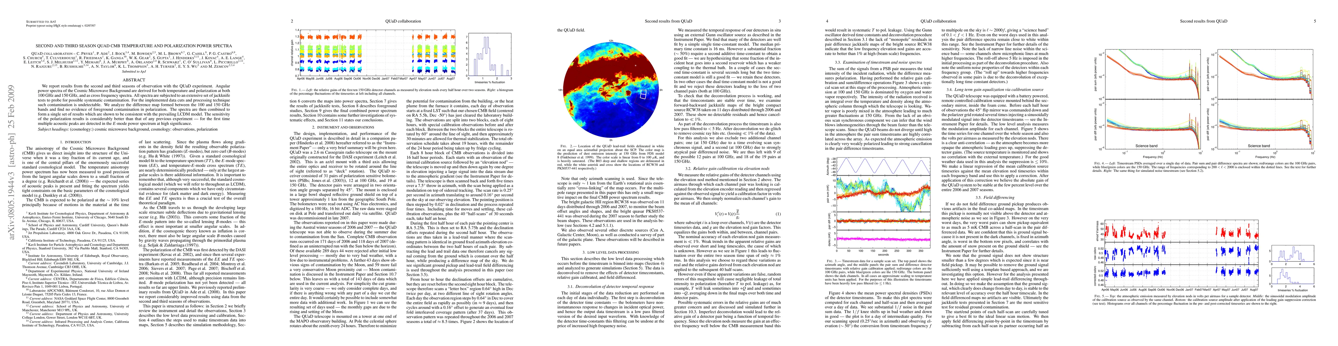 We report results from the second and third seasons of observation with the QUaD experiment. Angular power spectra of the Cosmic Microwave Background are derived for both temperature and polarization at both 100 GHz and 150 GHz, and as cross frequency spectra. All spectra are subjected to an extensive set of jackknife tests to probe for possible systematic contamination. For the implemented data cuts and processing technique such contamination is undetectable. We analyze the difference map formed between the 100 and 150 GHz bands and find no evidence of foreground contamination in polarization. The spectra are then combined to form a single set of results which are shown to be consistent with the prevailing LCDM model. The sensitivity of the polarization results is considerably better than that of any previous experiment -- for the first time multiple acoustic peaks are detected in the E-mode power spectrum at high significance.