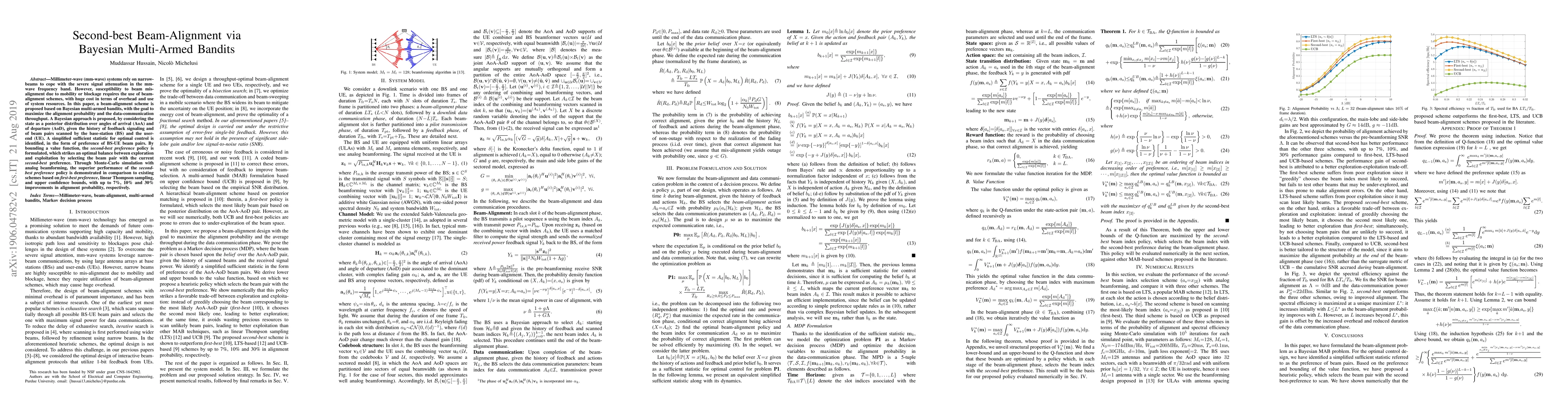 This paper proposes a beam-alignment scheme for millimeter-wave systems using Bayesian multi-armed bandits to maximize alignment probability and throughput. The approach selects beam pairs based on a second-best preference policy, demonstrating superior performance over existing methods with up to 30% improvement in alignment probability.