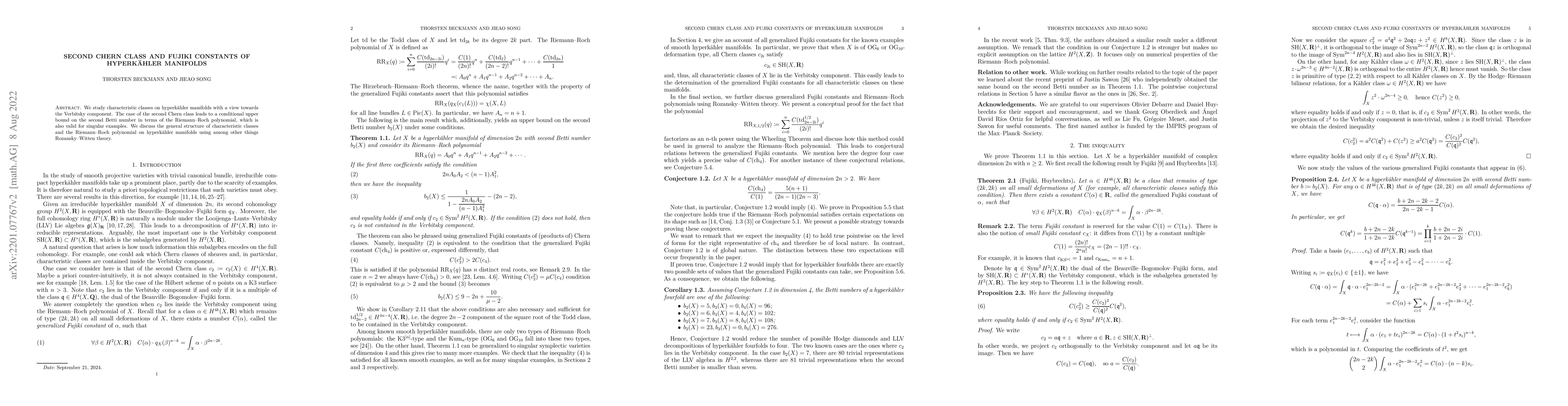 Summary: This paper explores the second Chern class and Fujiki constants on hyperkähler manifolds, deriving a conditional upper bound for the second Betti number in relation to the Riemann-Roch polynomial, applicable to both regular and singular examples. It utilizes Rozansky-Witten theory to analyze the general structure of characteristic classes.