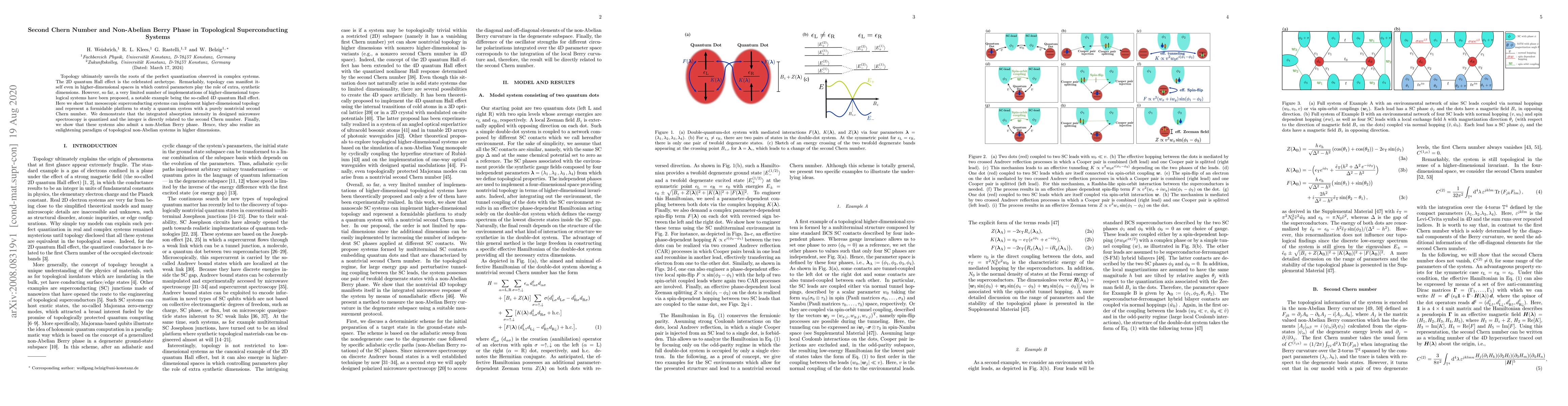 This paper explores the implementation of higher-dimensional topological systems in mesoscopic superconducting systems, demonstrating quantized absorption intensity linked to a nontrivial second Chern number and revealing a non-Abelian Berry phase, thus providing a platform for studying topological non-Abelian systems.