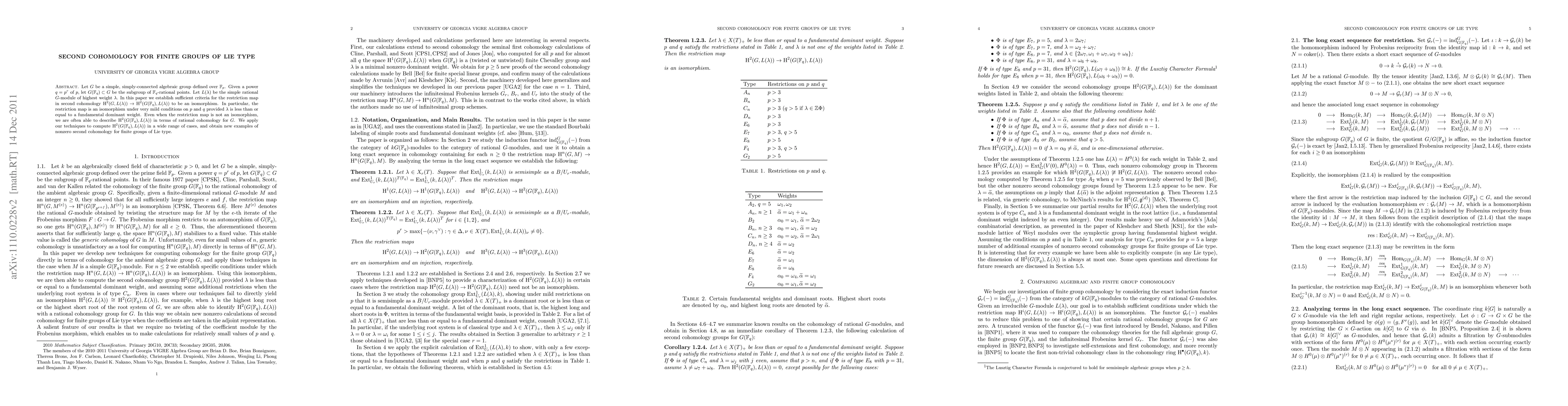 This paper establishes criteria for the second cohomology restriction map $H^2(G,L(\lambda)) \rightarrow H^2(G(\mathbb{F}_q),L(\lambda))$ to be an isomorphism for finite groups of Lie type under mild conditions on $p$ and $q$, and when $\lambda$ is less than or equal to a fundamental dominant weight. It also provides methods to compute $H^2(G(\mathbb{F}_q),L(\lambda))$ when the map is not an isomorphism.