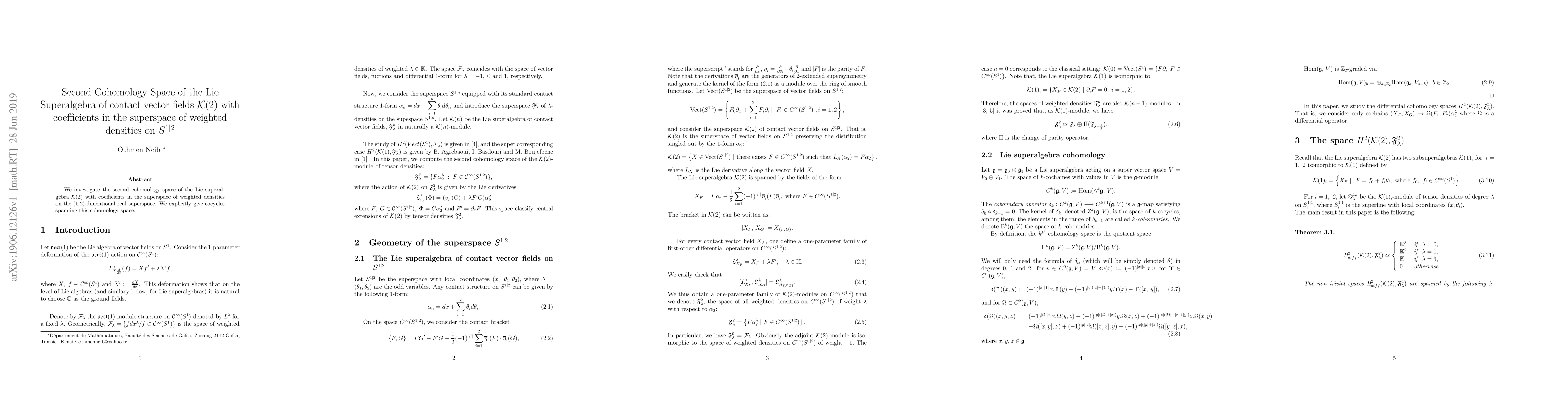 We investigate the second cohomology space of the Lie superalgebra $\mathcal{K}(2)$ with coefficients in the superspace of weighted densities on the (1,2)-dimentional real superspace. We explicitly give cocycles spanning this cohomology space.