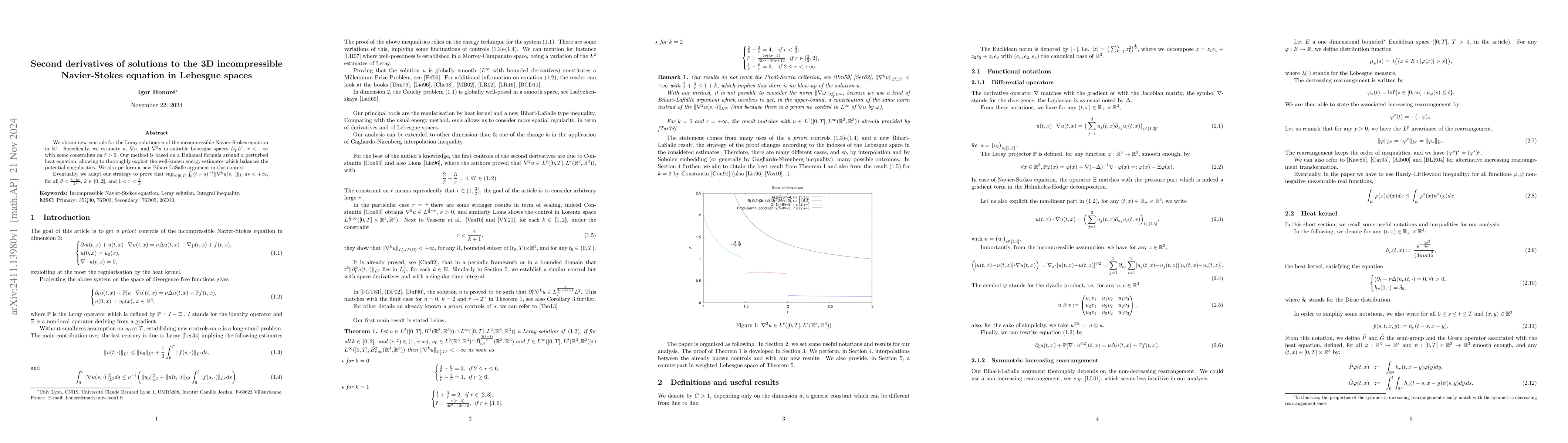 This paper provides new estimates for the second derivatives of Leray solutions to the 3D incompressible Navier-Stokes equation in Lebesgue spaces, employing a Duhamel formula and Bihari-LaSalle argument. It demonstrates finiteness of a certain integral involving the second derivatives under specified conditions on $\theta$, $k$, and $r$.