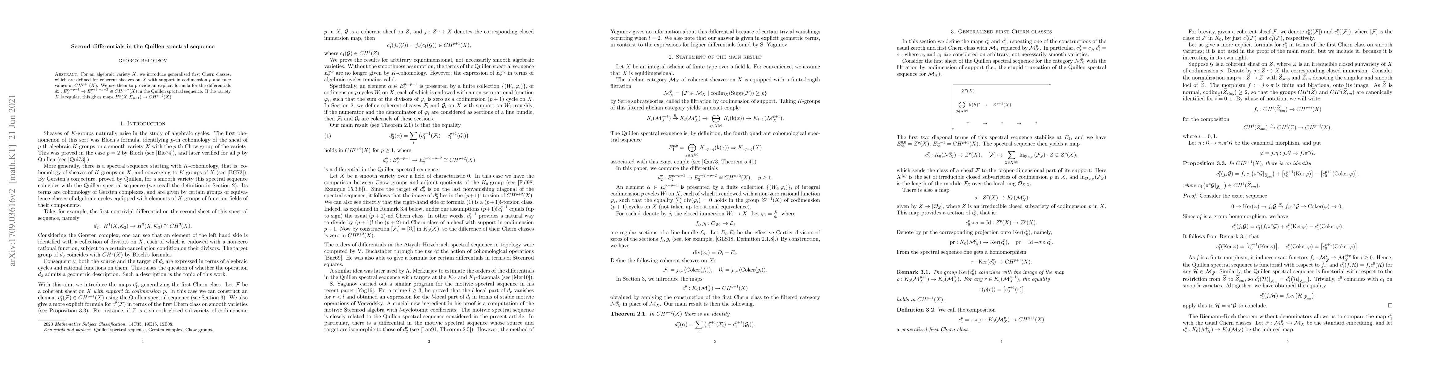 Researchers introduce generalized first Chern classes to calculate Quillen spectral sequence differentials, providing an explicit formula for a specific part of the sequence in terms of cohomology classes of an algebraic variety.