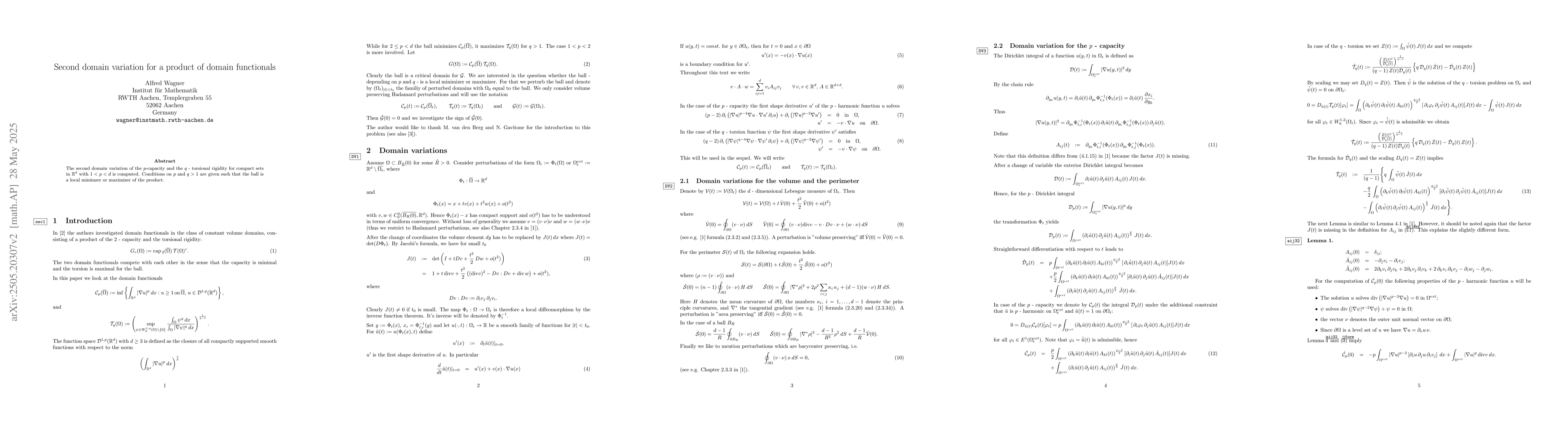 The computation of second domain variation for the product of $p$-capacity and $q$-torsional rigidity, along with identifying conditions for local minimizers and maximizers.