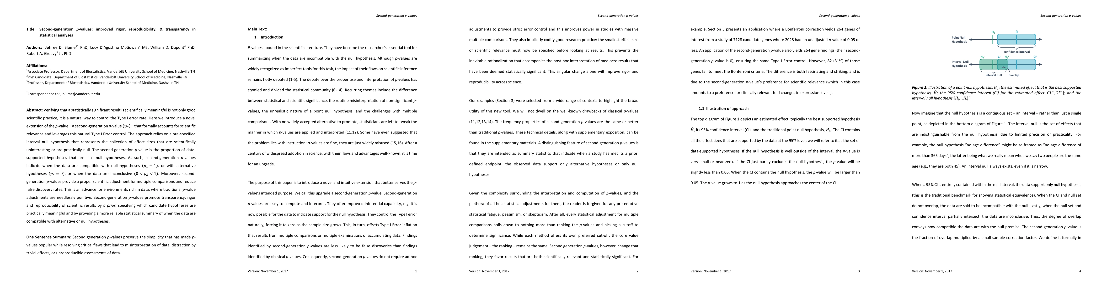 Verifying that a statistically significant result is scientifically meaningful is not only good scientific practice, it is a natural way to control the Type I error rate. Here we introduce a novel extension of the p-value - a second-generation p-value - that formally accounts for scientific relevance and leverages this natural Type I Error control. The approach relies on a pre-specified interval null hypothesis that represents the collection of effect sizes that are scientifically uninteresting or are practically null. The second-generation p-value is the proportion of data-supported hypotheses that are also null hypotheses. As such, second-generation p-values indicate when the data are compatible with null hypotheses, or with alternative hypotheses, or when the data are inconclusive. Moreover, second-generation p-values provide a proper scientific adjustment for multiple comparisons and reduce false discovery rates. This is an advance for environments rich in data, where traditional p-value adjustments are needlessly punitive. Second-generation p-values promote transparency, rigor and reproducibility of scientific results by a priori specifying which candidate hypotheses are practically meaningful and by providing a more reliable statistical summary of when the data are compatible with alternative or null hypotheses.