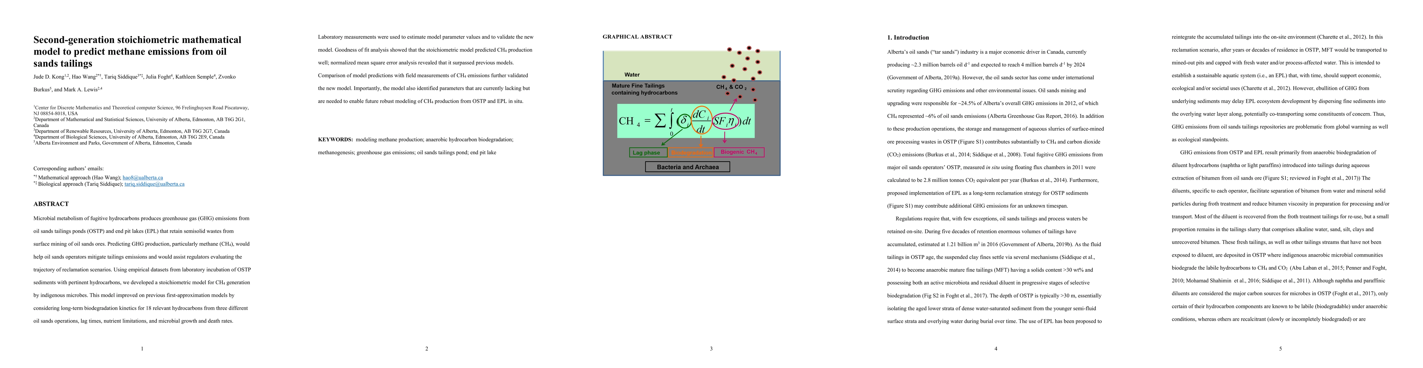 This paper presents a refined stoichiometric model to predict methane emissions from oil sands tailings, improving upon previous models by incorporating long-term biodegradation kinetics, lag times, nutrient limitations, and microbial growth and death rates. The model was validated using laboratory data and field measurements, showing better accuracy than earlier versions.