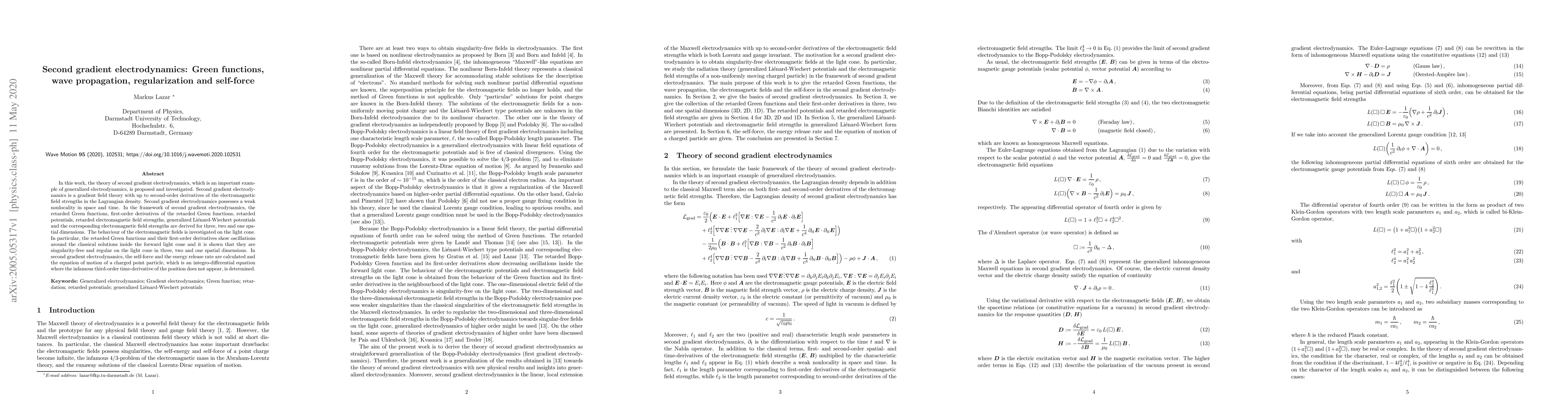 This paper proposes and investigates second gradient electrodynamics, a generalized theory with second-order derivatives in the electromagnetic field. It derives various Green functions, potentials, and field strengths, demonstrating their behavior and singularity-free nature on the light cone, and determines the equation of motion for a charged particle without the third-order time-derivative.