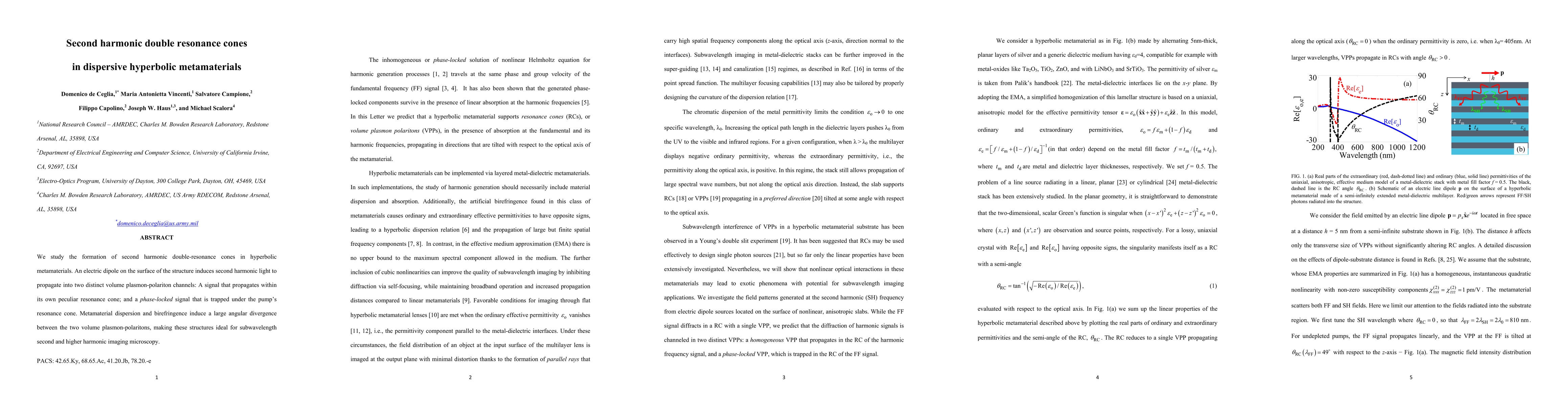 We study the formation of second harmonic double-resonance cones in hyperbolic metamaterials. An electric dipole on the surface of the structure induces second harmonic light to propagate into two distinct volume plasmon-polariton channels: A signal that propagates within its own peculiar resonance cone; and a phase-locked signal that is trapped under the pump's resonance cone. Metamaterial dispersion and birefringence induce a large angular divergence between the two volume plasmon-polaritons, making these structures ideal for subwavelength second and higher harmonic imaging microscopy.
