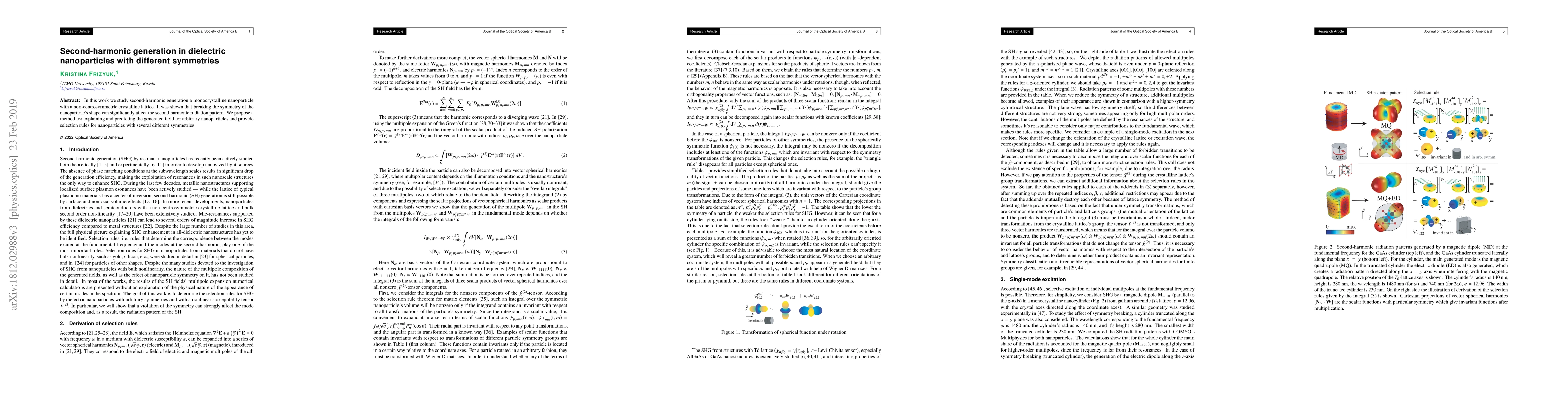 This study investigates second harmonic generation in non-centrosymmetric monocrystalline nanoparticles, revealing that the symmetry of the nanoparticle's shape notably influences the harmonic radiation pattern. The researchers propose a predictive method and selection rules for understanding the generated fields across various nanoparticle symmetries.