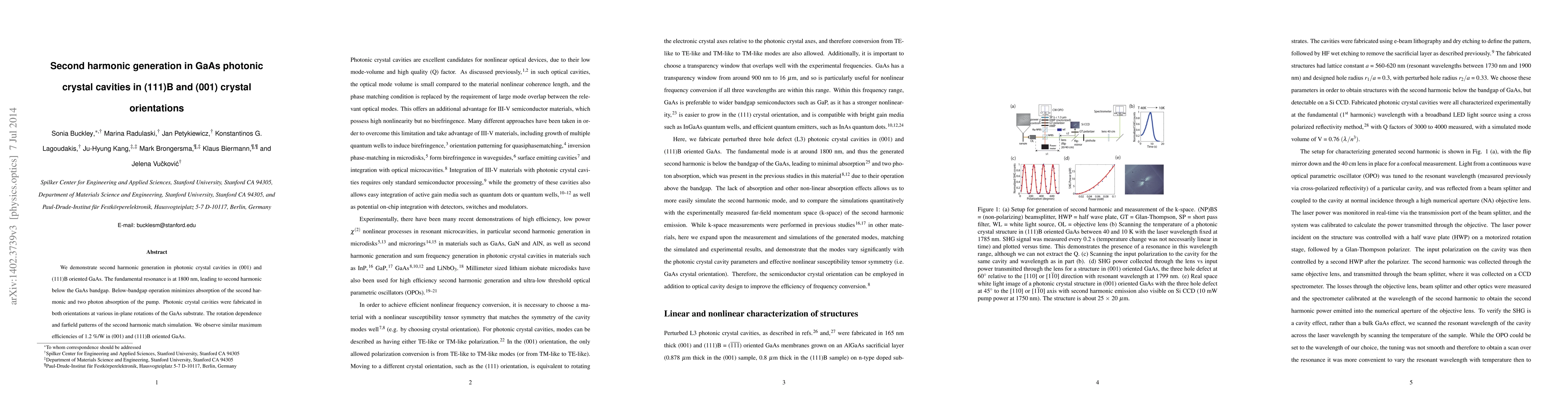 This study demonstrates second harmonic generation in GaAs photonic crystal cavities oriented along (001) and (111)B, achieving operation below the GaAs bandgap to minimize absorption. Both orientations show similar maximum efficiencies of 1.2 %/W.