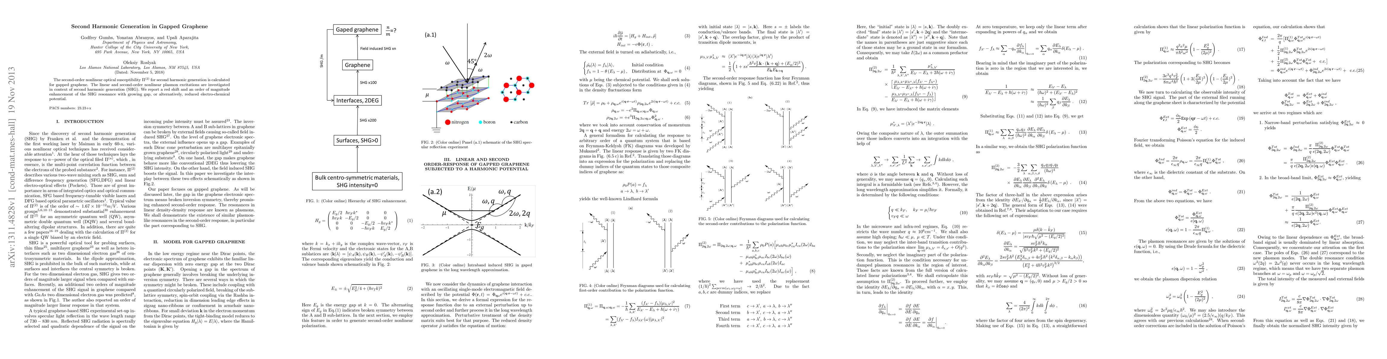 This paper investigates the second harmonic generation (SHG) in gapped graphene, revealing an enhancement in the SHG resonance by an order of magnitude and a red shift as the gap, or reduced electro-chemical potential, increases. The study focuses on the linear and nonlinear plasmon excitations relevant to SHG.