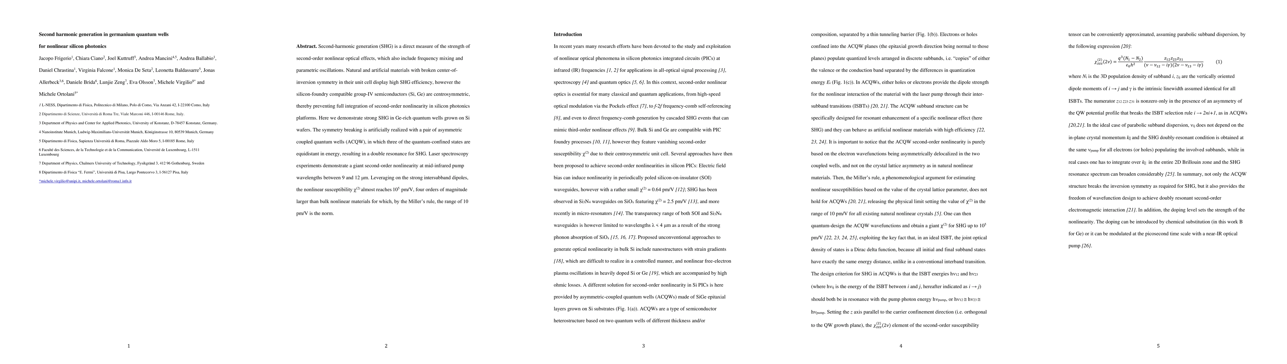 This paper demonstrates strong second-harmonic generation (SHG) in germanium quantum wells on silicon wafers, utilizing asymmetric coupled quantum wells to break symmetry artificially. Experiments reveal significant second-order nonlinearity, potentially advancing silicon photonics integration.