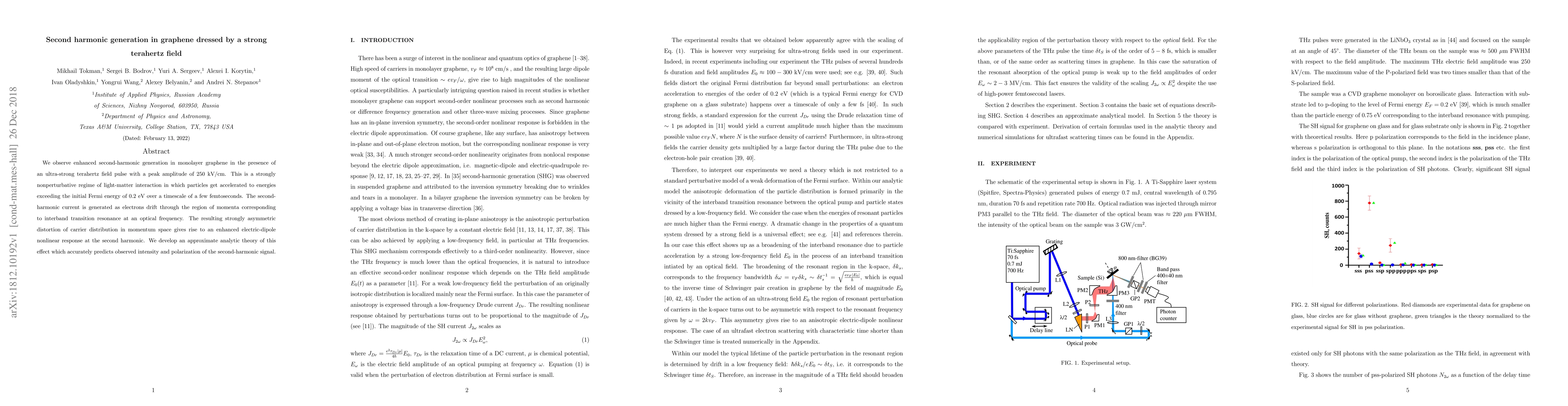 This paper reports enhanced second-harmonic generation in monolayer graphene under the influence of a strong terahertz field, revealing a nonperturbative light-matter interaction regime. The study develops an analytic theory that accurately predicts the observed intensity and polarization of the second-harmonic signal.