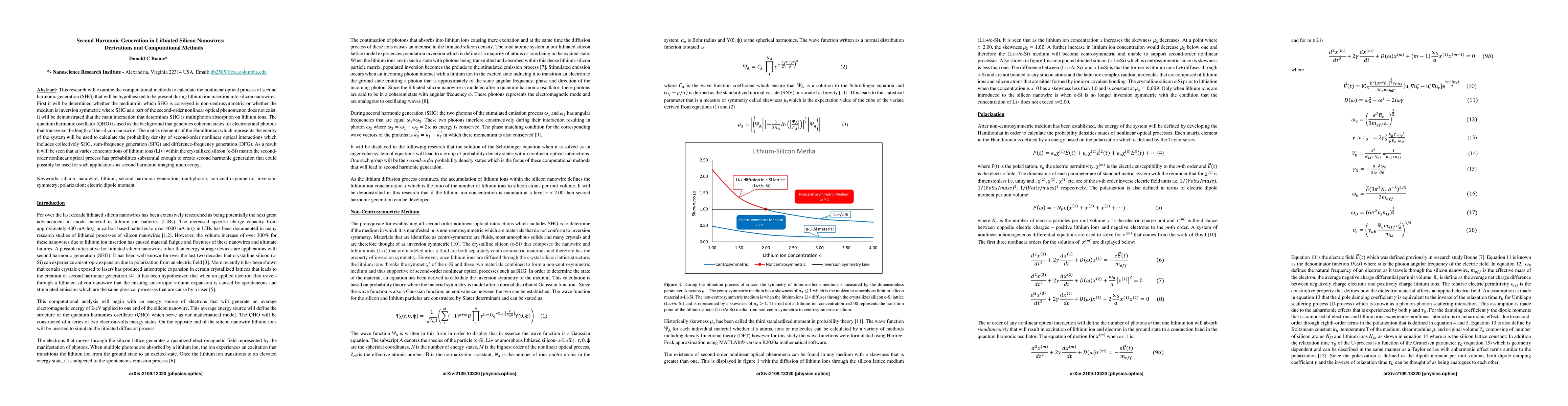 This research investigates computational methods to determine the presence of second harmonic generation (SHG) during lithium ion insertion into silicon nanowires, using the quantum harmonic oscillator to model electron and photon interactions. It finds that multiphoton absorption on lithium ions drives SHG, with potential applications in second harmonic imaging microscopy.