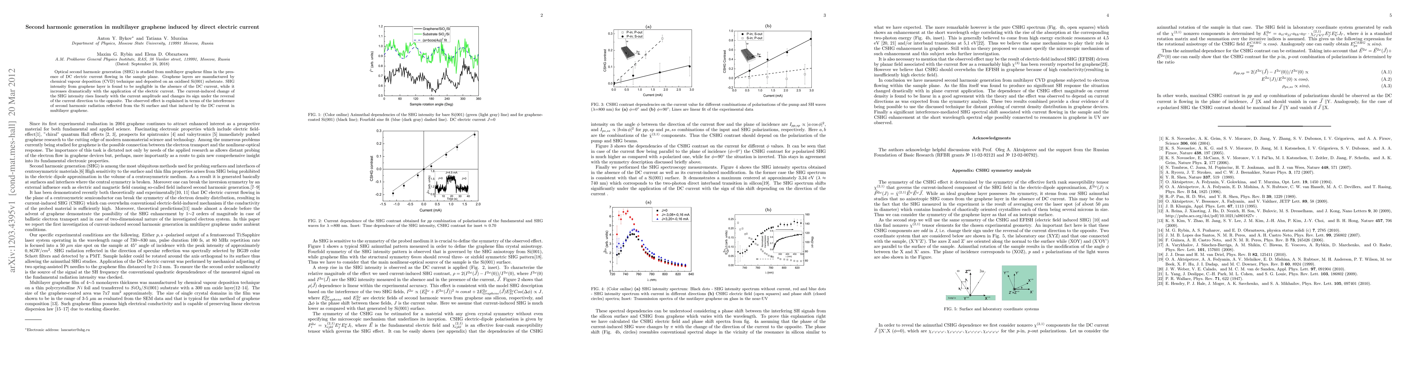 This study investigates optical second harmonic generation (SHG) in multilayer graphene subjected to direct electric current, finding negligible SHG without current but a dramatic increase with its application. The current-induced SHG intensity varies linearly with current amplitude and inverts with current direction reversal, attributed to interference effects from the Si surface and the current-induced changes in graphene.