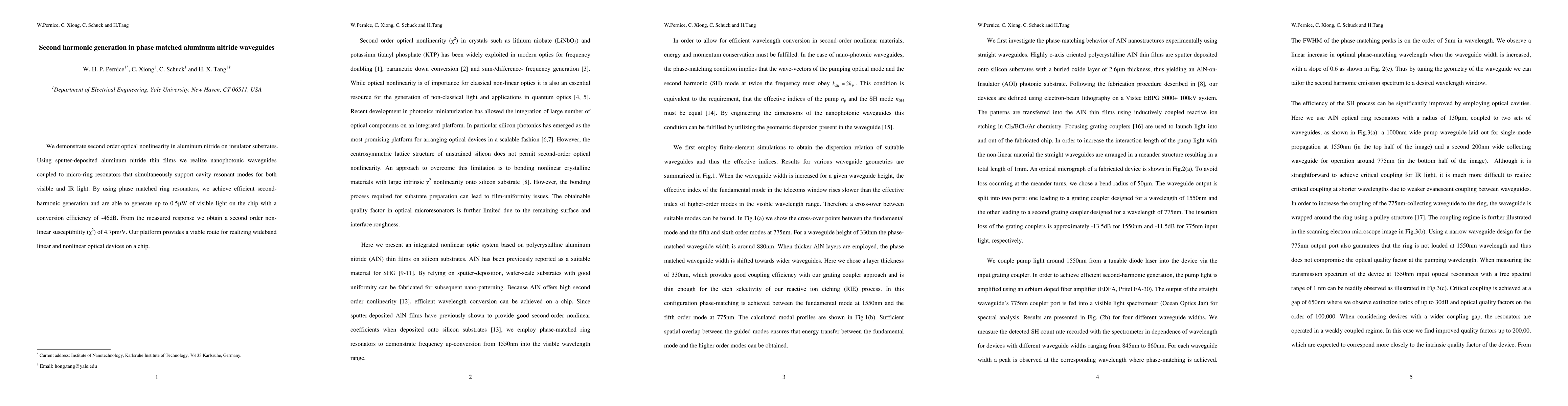 This research demonstrates efficient second-harmonic generation in phase-matched aluminum nitride waveguides on insulator substrates, achieving up to 0.5uW of visible light with a conversion efficiency of -46dB, and measures a second-order non-linear susceptibility of 4.7pm/V. The study presents a promising platform for wideband linear and nonlinear optical devices on a chip.