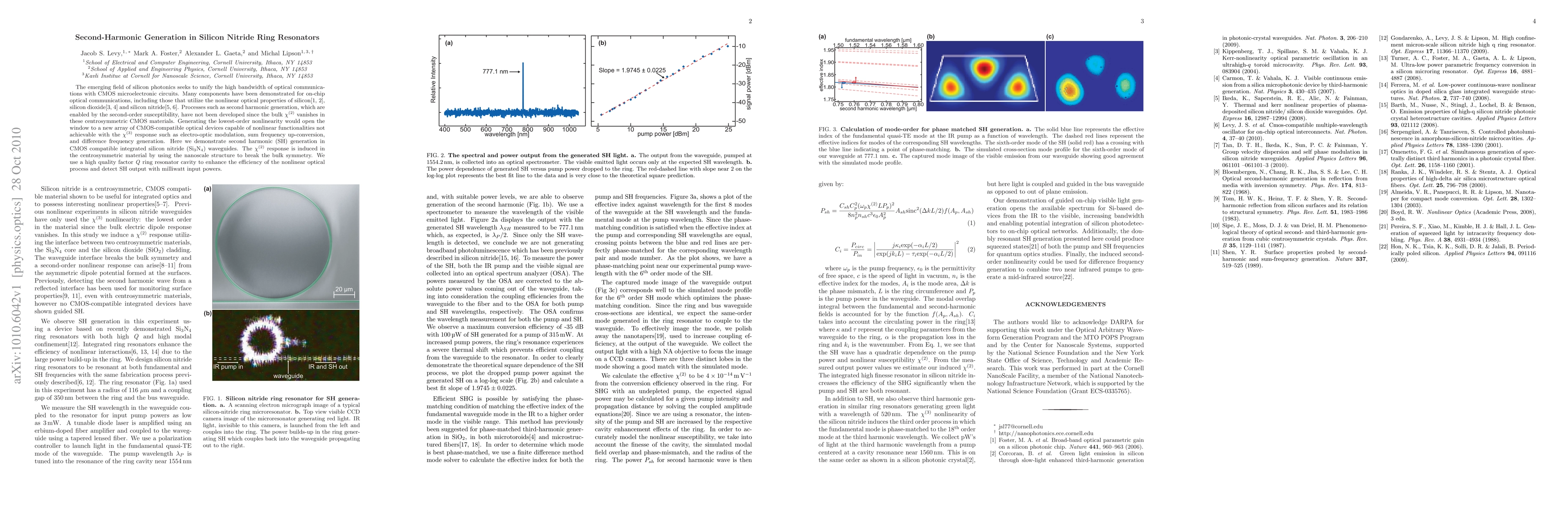 This paper demonstrates second harmonic generation in silicon nitride ring resonators, utilizing nanoscale structures to induce the necessary second-order susceptibility in a centrosymmetric material, and employs high-Q resonators to enhance the efficiency of the nonlinear optical process.