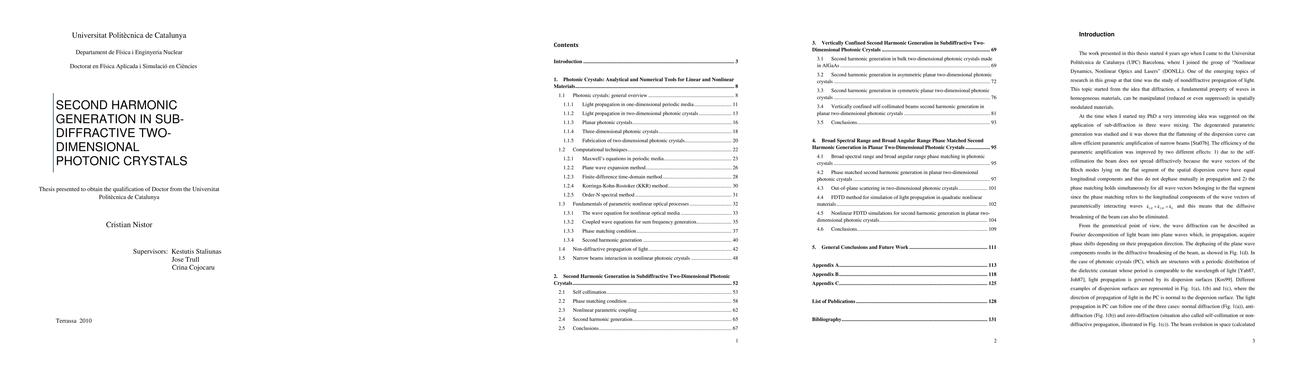 This research explores second harmonic generation in subdiffractive two-dimensional photonic crystals, demonstrating that efficient nonlinear interactions can occur when both fundamental and second harmonic frequencies are within the self-collimation region. The study enhances interaction efficiency through phase matching and presents theoretical and computational insights for various photonic crystal configurations.