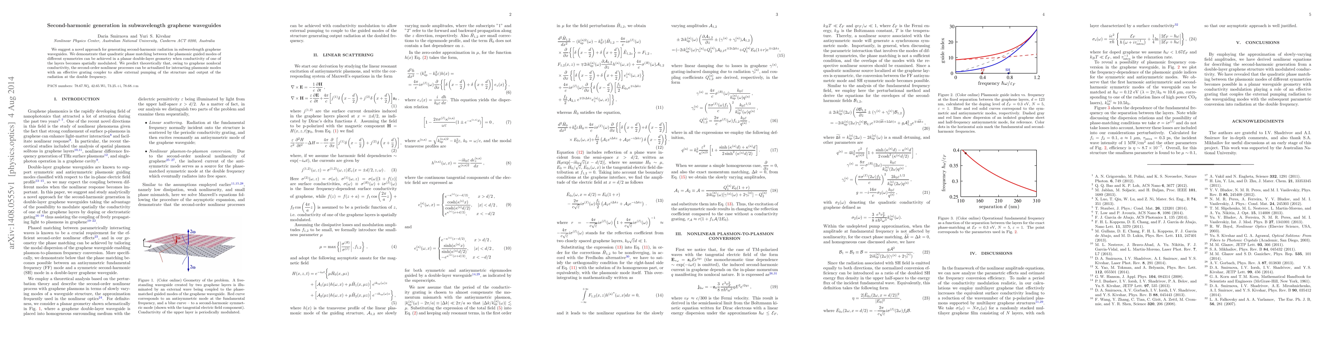 This research proposes a new method for generating second-harmonic radiation using subwavelength graphene waveguides. The approach leverages quadratic phase matching in a planar double-layer geometry, utilizing spatially modulated conductivity in one layer to achieve effective nonlinear processes and output radiation at double the input frequency.