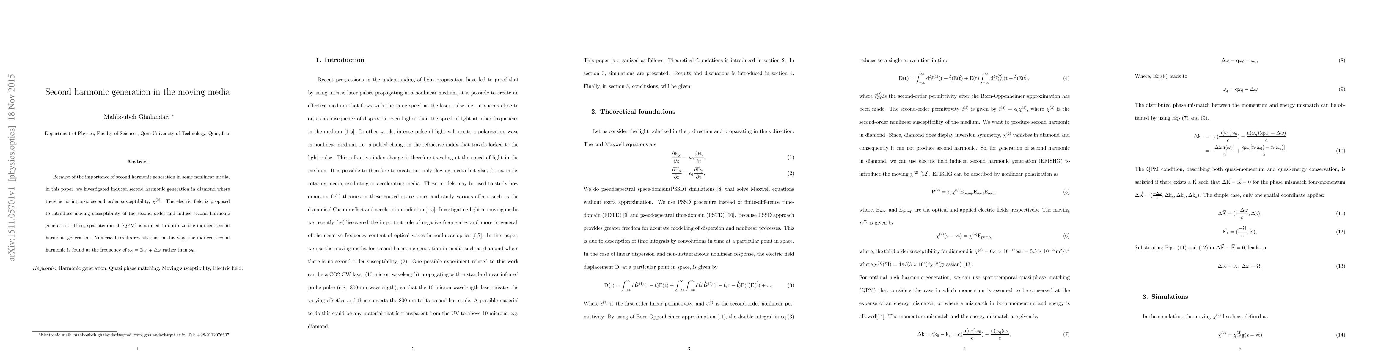 This paper investigates second harmonic generation in diamond, a medium lacking intrinsic second-order susceptibility, by introducing moving susceptibility via electric fields. The quasi-phase-matching (QPM) technique optimizes this induced second harmonic generation, resulting in output at a frequency of ω(2) = 2ω(0) ± Δω.