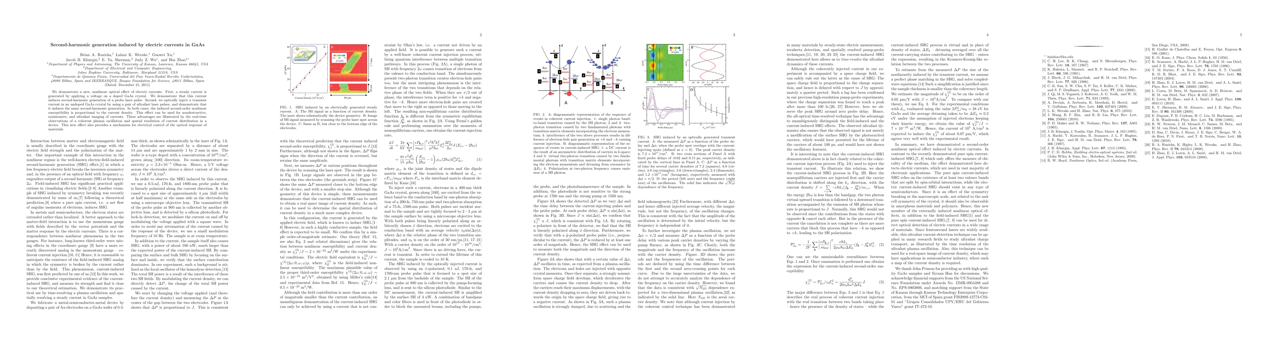 This paper demonstrates a novel nonlinear optical effect where electric currents in GaAs crystals induce second-harmonic generation, enabling nondestructive imaging of current distributions. The effect is shown to be proportional to current density and can be used for ultrafast, noninvasive imaging of coherent plasma oscillations and electrical control of optical responses.