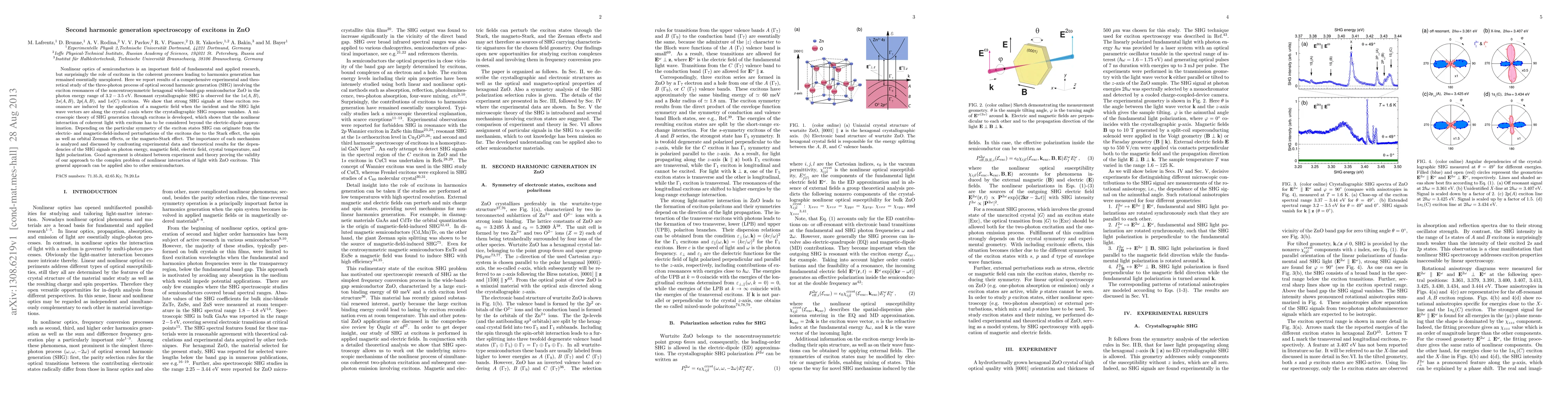 Nonlinear optics of semiconductors is an important field of fundamental and applied research, but surprisingly the role of excitons in the coherent processes leading to harmonics generation has remained essentially unexplored. Here we report results of a comprehensive experimental and theoretical study of the three-photon process of optical second harmonic generation (SHG) involving the exciton resonances of the noncentrosymmetric hexagonal wide-band-gap semiconductor ZnO in the photon energy range of 3.2-3.5 eV. Resonant crystallographic SHG is observed for the 1s(A,B), 2s(A,B), 2p(A,B), and 1s(C) excitons. We show that strong SHG signals at these exciton resonances are induced by the application of a magnetic field when the incident and the SHG light wave vectors are along the crystal z-axis where the crystallographic SHG response vanishes. A microscopic theory of SHG generation through excitons is developed, which shows that the nonlinear interaction of coherent light with excitons has to be considered beyond the electric-dipole approximation. Depending on the particular symmetry of the exciton states SHG can originate from the electric- and magnetic-field-induced perturbations of the excitons due to the Stark effect, the spin as well as orbital Zeeman effects, or the magneto-Stark effect. The importance of each mechanism is analyzed and discussed by confronting experimental data and theoretical results for the dependencies of the SHG signals on photon energy, magnetic field, electric field, crystal temperature, and light polarization. Good agreement is obtained between experiment and theory proving the validity of our approach to the complex problem of nonlinear interaction of light with ZnO excitons. This general approach can be applied also to other semiconductors.
