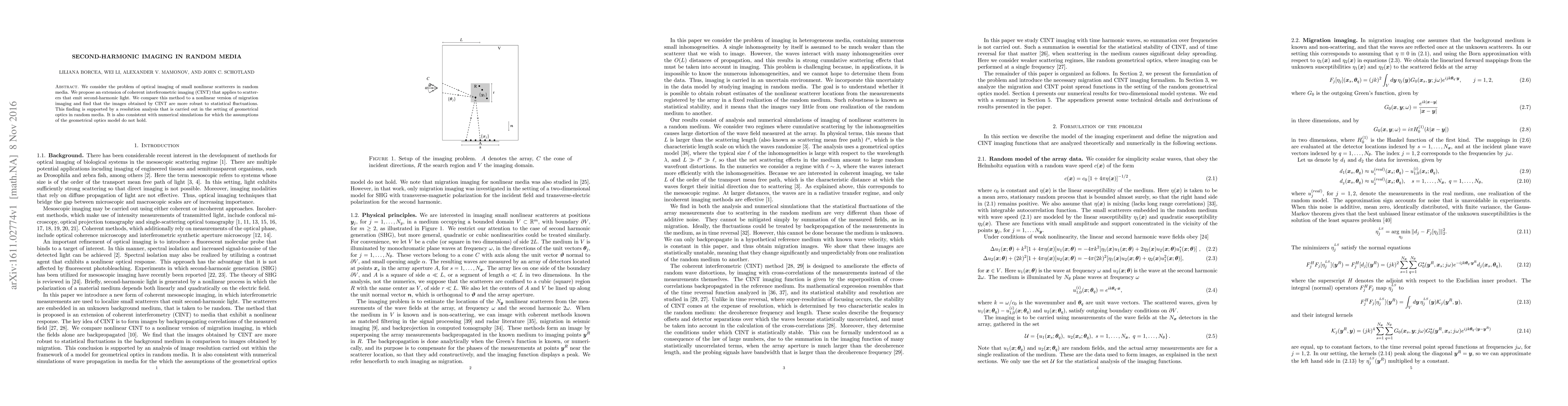 We consider the problem of optical imaging of small nonlinear scatterers in random media. We propose an extension of coherent interferometric imaging (CINT) that applies to scatterers that emit second-harmonic light. We compare this method to a nonlinear version of migration imaging and find that the images obtained by CINT are more robust to statistical fluctuations. This finding is supported by a resolution analysis that is carried out in the setting of geometrical optics in random media. It is also consistent with numerical simulations for which the assumptions of the geometrical optics model do not hold.