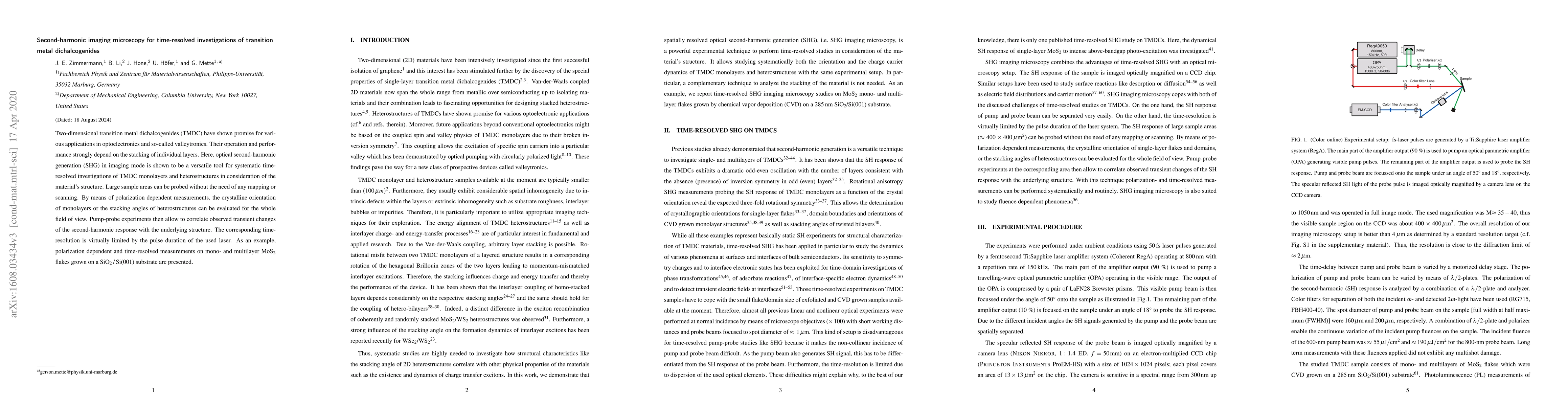 This paper demonstrates the use of second-harmonic generation (SHG) imaging microscopy for time-resolved studies of transition metal dichalcogenides (TMDC), focusing on their structural properties and transient changes. The method allows for large-area, non-scanning investigations of TMDC monolayers and heterostructures, providing insights into their crystalline orientation and stacking angles.