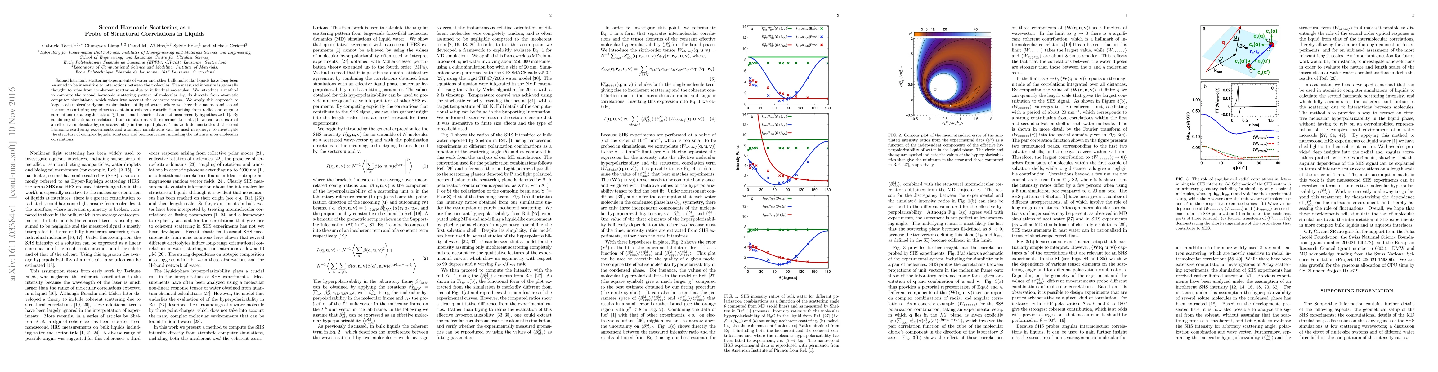 Second-harmonic scattering experiments of water and other bulk molecular liquids have long been assumed to be insensitive to interactions between the molecules. The measured intensity is generally thought to arise from incoherent scattering due to individual molecules. We introduce a method to compute the second-harmonic scattering pattern of molecular liquids directly from atomistic computer simulations, which takes into account the coherent terms. We apply this approach to large-scale molecular dynamics simulations of liquid water, where we show that nanosecond second-harmonic scattering experiments contain a coherent contribution arising from radial and angular correlations on a length scale of < 1 nm, much shorter than had been recently hypothesized (Shelton, D. P. J. Chem. Phys. 2014, 141). By combining structural correlations from simulations with experimental data (Shelton, D. P. J. Chem. Phys. 2014, 141), we can also extract an effective molecular hyperpolarizability in the liquid phase. This work demonstrates that second-harmonic scattering experiments and atomistic simulations can be used in synergy to investigate the structure of complex liquids, solutions, and biomembranes, including the intrinsic intermolecular correlations.