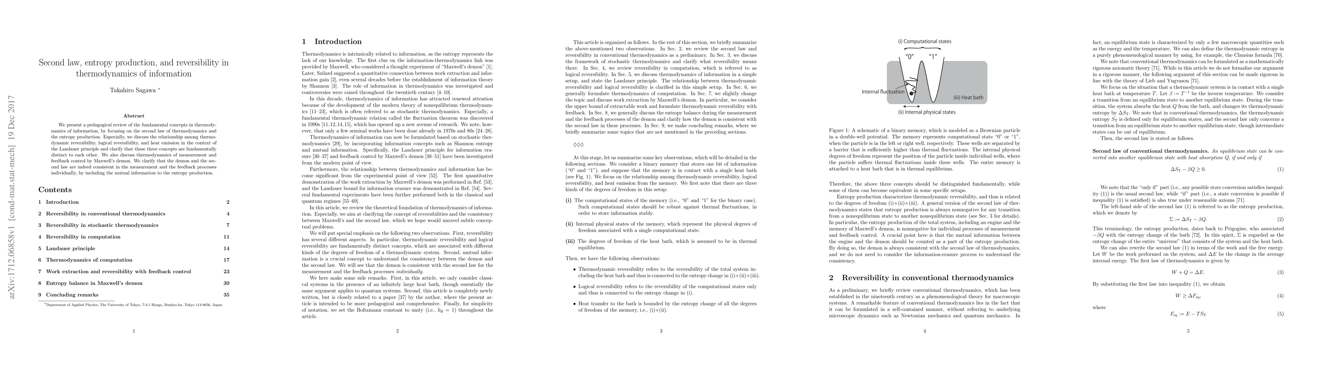 This paper reviews the thermodynamics of information, emphasizing the second law and entropy production, and clarifies the distinctions between thermodynamic reversibility, logical reversibility, and heat emission, particularly in the context of Landauer's principle. It also discusses the thermodynamics of measurement and feedback control, showing the consistency of Maxwell's demon with the second law when mutual information is considered.