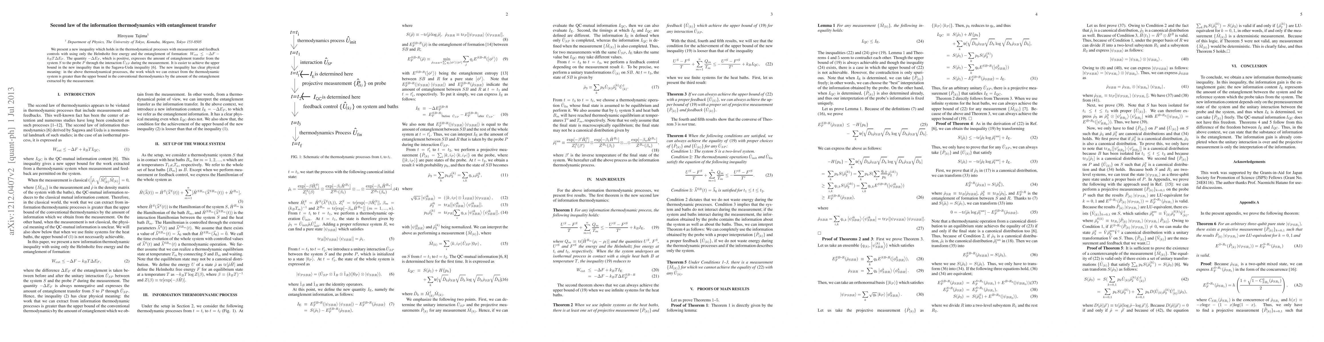 We present a new inequality which holds in the thermodynamical processes with measurement and feedback controls with using only the Helmholtz free energy and the entanglement of formation: $W_{\mathrm{ext}}\le-\Delta F-k_{B}T\Delta E_{F}$. The quantity $-\Delta E_{F}$, which is positive, expresses the amount of entanglement transfer from the system $S$ to the probe $P$ through the interaction $\hat{U}_{SP}$ during the measurement. It is easier to achieve the upper bound in the new inequality than in the Sagawa-Ueda inequality [Phys. Rev. Lett. 100 080403 (2008)]. The new inequality has clear physical meaning: in the above thermodynamical processes, the work which we can extract from the thermodynamic system is greater than the upper bound in the conventional thermodynamics by the amount of the entanglement extracted by the measurement.