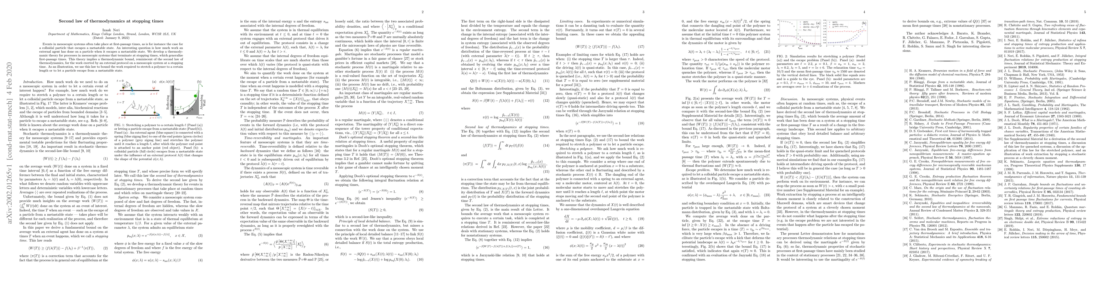 Events in mesoscopic systems often take place at first-passage times, as is for instance the case for a colloidal particle that escapes a metastable state. An interesting question is how much work an external agent has done on a particle when it escapes a metastable state. We develop a thermodynamic theory for processes in mesoscopic systems that terminate at stopping times, which generalize first-passage times. This theory implies a thermodynamic bound, reminiscent of the second law of thermodynamics, for the work exerted by an external protocol on a mesoscopic system at a stopping time. As an illustration, we use this law to bound the work required to stretch a polymer to a certain length or to let a particle escape from a metastable state.