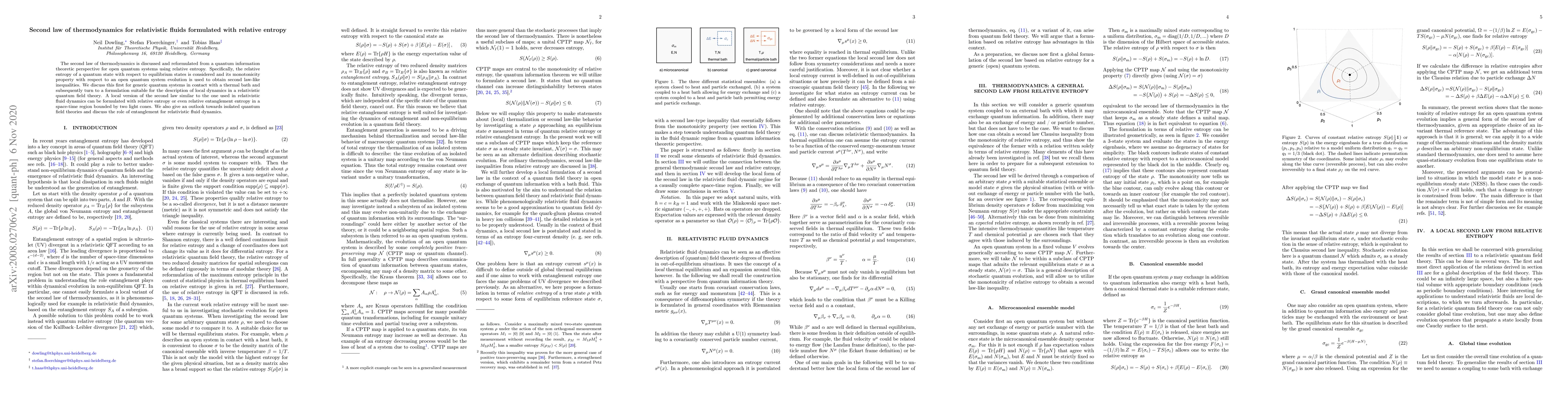 The second law of thermodynamics is discussed and reformulated from a quantum information theoretic perspective for open quantum systems using relative entropy. Specifically, the relative entropy of a quantum state with respect to equilibrium states is considered and its monotonicity property with respect to an open quantum system evolution is used to obtain second law-like inequalities. We discuss this first for generic quantum systems in contact with a thermal bath and subsequently turn to a formulation suitable for the description of local dynamics in a relativistic quantum field theory. A local version of the second law similar to the one used in relativistic fluid dynamics can be formulated with relative entropy or even relative entanglement entropy in a space-time region bounded by two light cones. We also give an outlook towards isolated quantum field theories and discuss the role of entanglement for relativistic fluid dynamics.