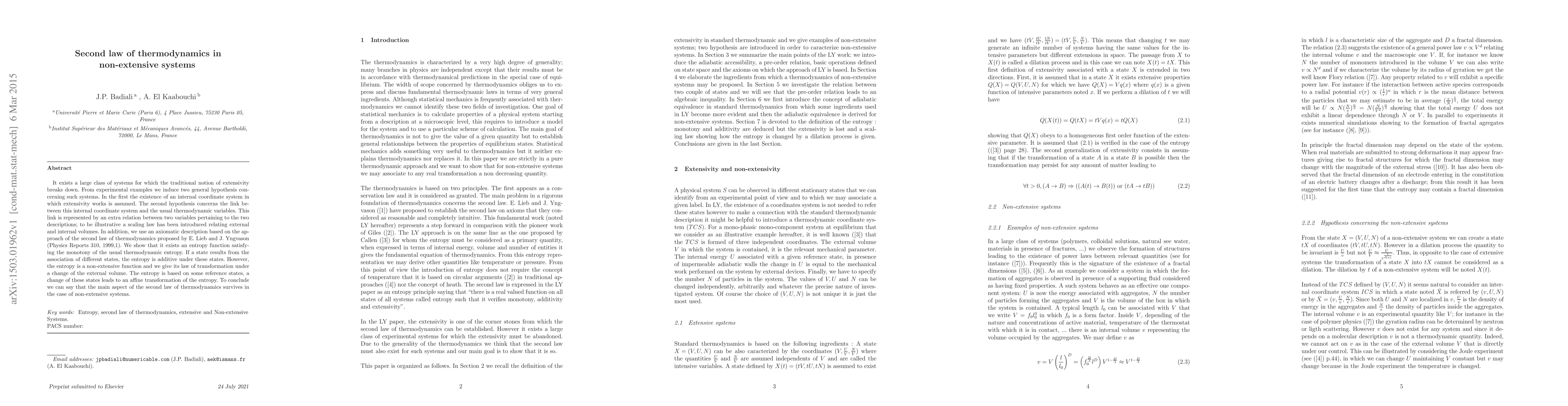 It exists a large class of systems for which the traditional notion of extensivity breaks down. From experimental examples we induce two general hypothesis concerning such systems. In the first the existence of an internal coordinate system in which extensivity works is assumed. The second hypothesis concerns the link between this internal coordinate system and the usual thermodynamic variables. This link is represented by an extra relation between two variables pertaining to the two descriptions; to be illustrative a scaling law has been introduced relating external and internal volumes. In addition, we use an axiomatic description based on the approach of the second law of thermodynamics proposed by E. Lieb and J. Yngvason (Physics Reports 310, 1999,1). We show that it exists an entropy function satisfying the monotony of the usual thermodynamic entropy. If a state results from the association of different states, the entropy is additive under these states. However, the entropy is a non-extensive function and we give its law of transformation under a change of the external volume. The entropy is based on some reference states, a change of these states leads to an affine transformation of the entropy. To conclude we can say that the main aspect of the second law of thermodynamics survives in the case of non-extensive systems.