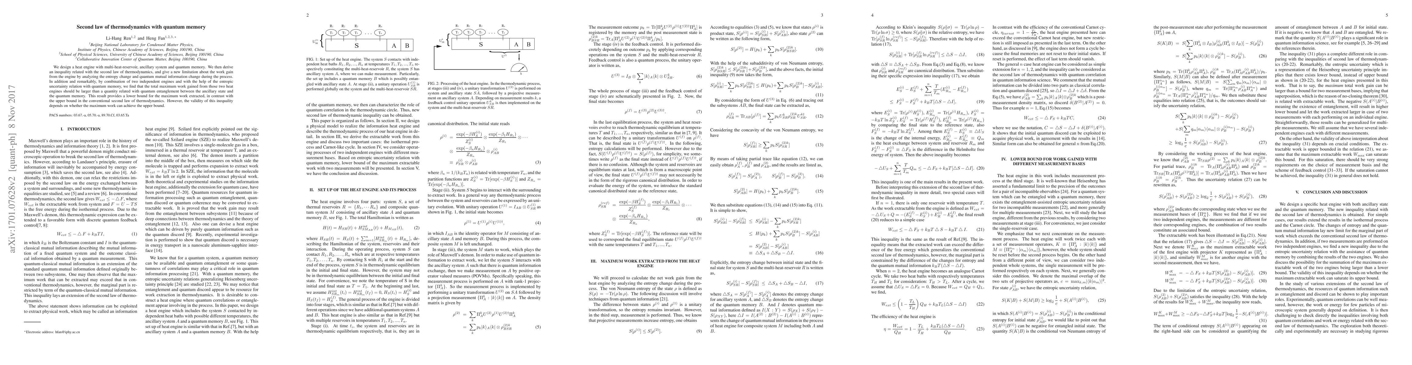 This paper designs a quantum heat engine with quantum memory and derives a new thermodynamic inequality, showing that the total maximum work from two combined engines exceeds a quantum entanglement-related quantity. This result provides a lower bound for maximum work, challenging the conventional upper bound of the second law of thermodynamics.