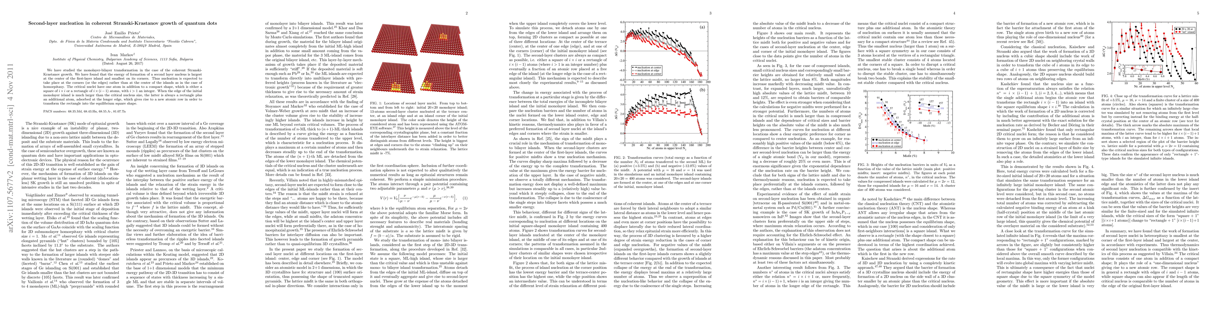 We have studied the monolayer-bilayer transformation in the case of the coherent Stranski-Krastanov growth. We have found that the energy of formation of a second layer nucleus is largest at the center of the first-layer island and smallest on its corners. Thus nucleation is expected to take place at the corners (or the edges) rather than at the center of the islands as in the case of homoepitaxy. The critical nuclei have one atom in addition to a compact shape, which is either a square of i*i or a rectangle of i*(i-1) atoms, with i>1 an integer. When the edge of the initial monolayer island is much larger than the critical nucleus size, the latter is always a rectangle plus an additional atom, adsorbed at the longer edge, which gives rise to a new atomic row in order to transform the rectangle into the equilibrium square shape.