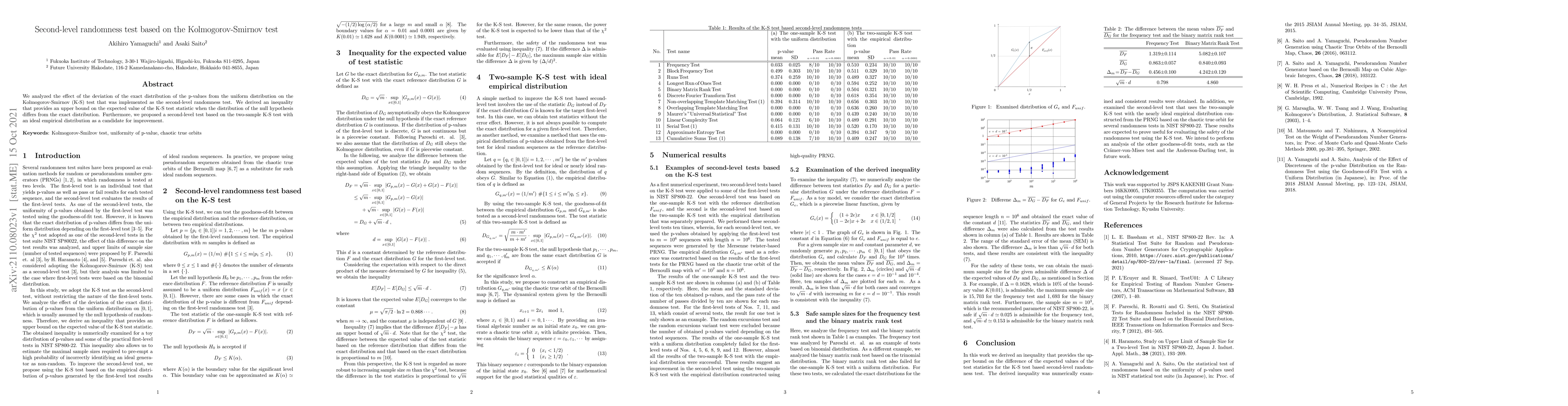We analyzed the effect of the deviation of the exact distribution of the p-values from the uniform distribution on the Kolmogorov-Smirnov (K-S) test that was implemented as the second-level randomness test. We derived an inequality that provides an upper bound on the expected value of the K-S test statistic when the distribution of the null hypothesis differs from the exact distribution. Furthermore, we proposed a second-level test based on the two-sample K-S test with an ideal empirical distribution as a candidate for improvement.