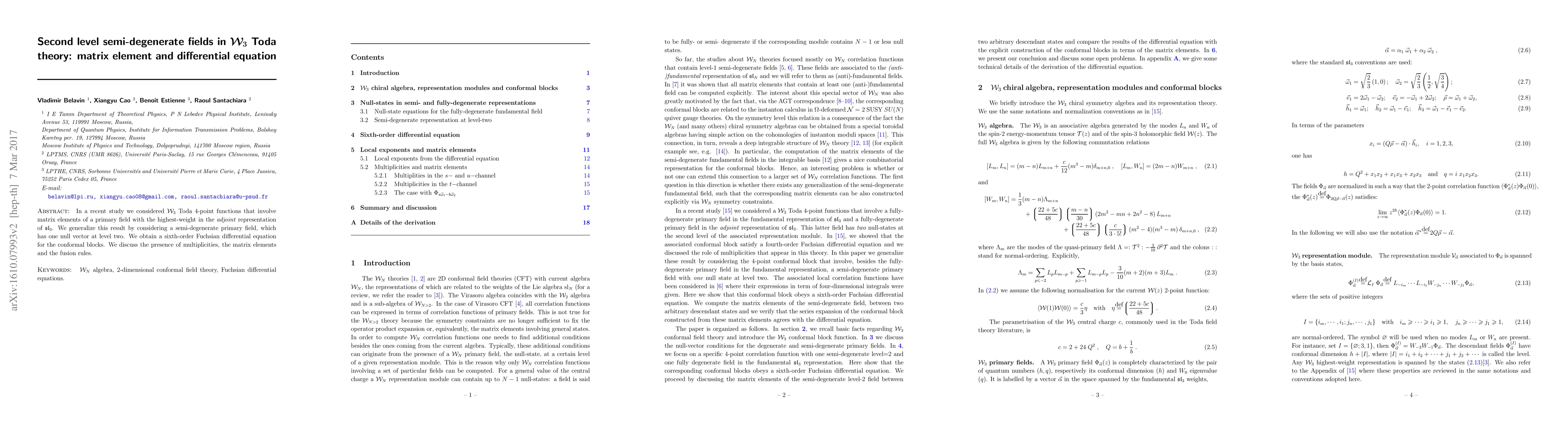 This paper generalizes W3 Toda theory to include semi-degenerate fields at level two, deriving a sixth-order Fuchsian differential equation for conformal blocks and discussing multiplicities, matrix elements, and fusion rules.