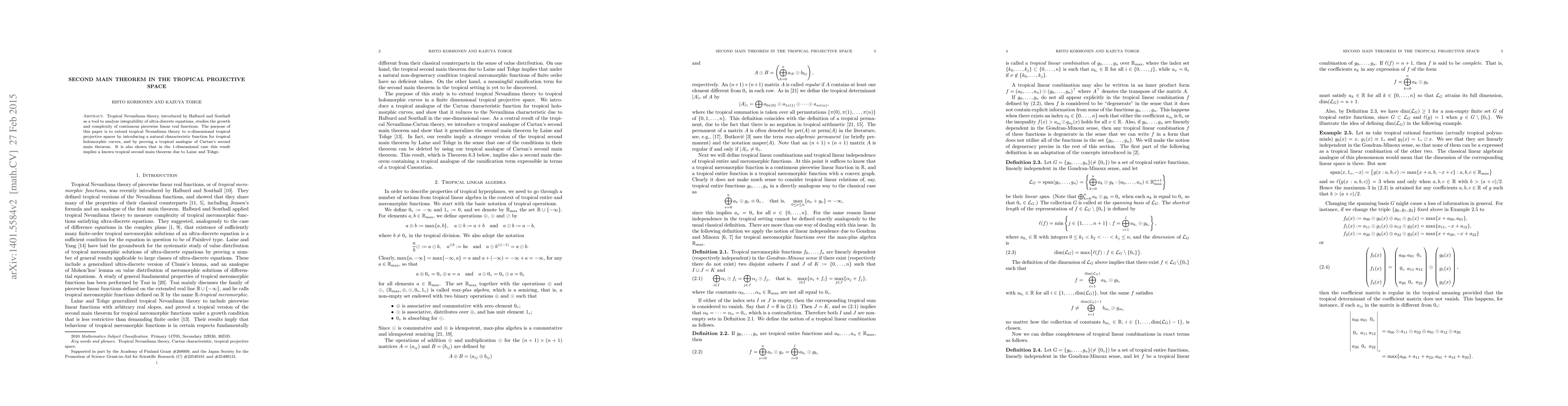 This paper extends tropical Nevanlinna theory to n-dimensional tropical projective spaces, establishing a tropical analogue of Cartan's second main theorem and demonstrating its equivalence to a known result in the 1-dimensional case.