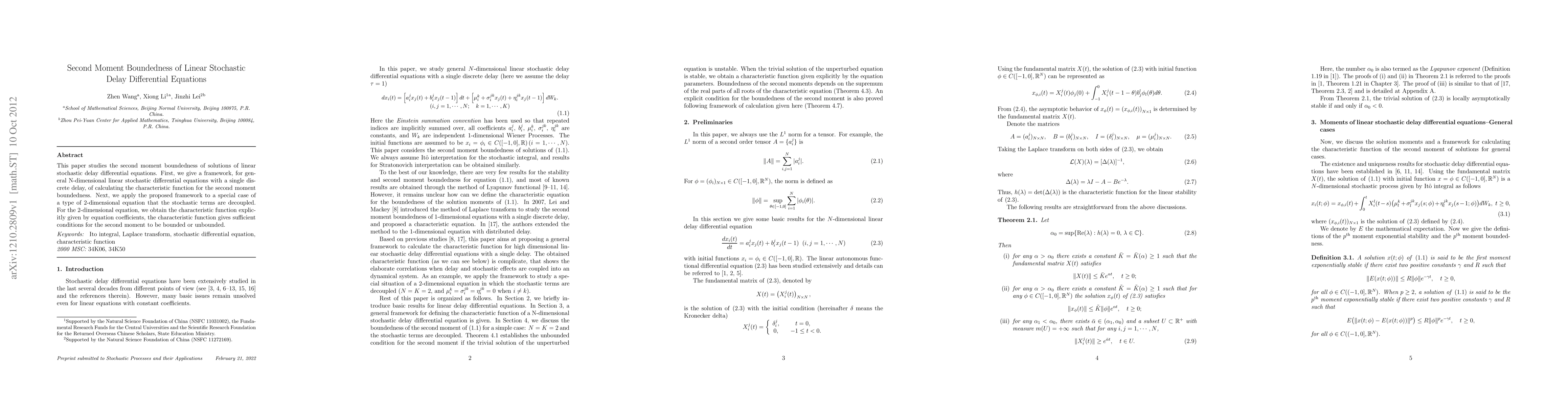 This paper develops a framework for determining second moment boundedness in N-dimensional linear stochastic delay differential equations, then applies it to a 2-dimensional case with decoupled stochastic terms, deriving explicit characteristic functions that provide conditions for boundedness of second moments.