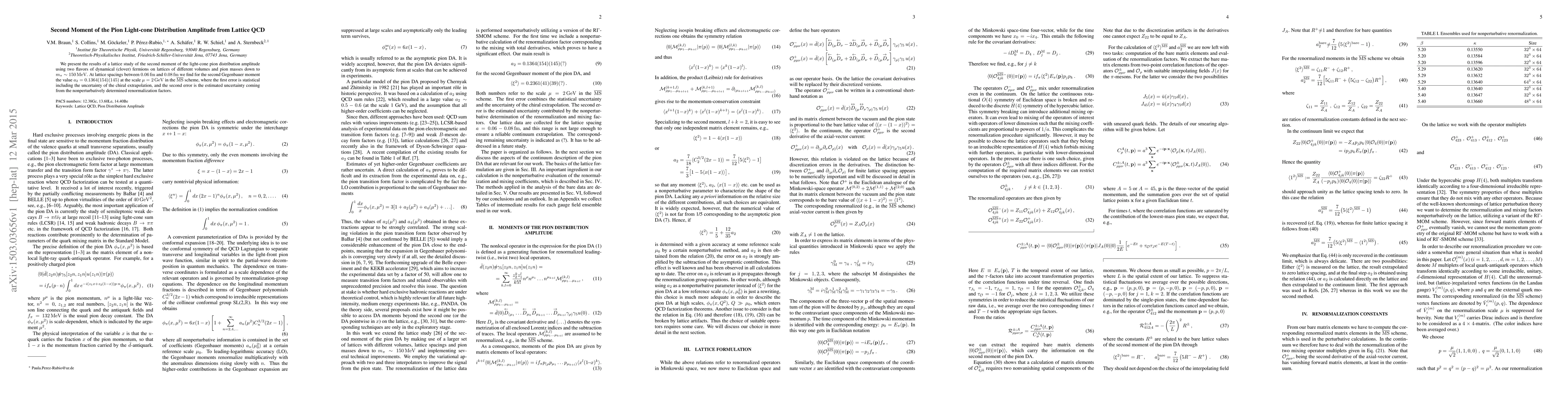 We present the results of a lattice study of the second moment of the light-cone pion distribution amplitude using two flavors of dynamical (clover) fermions on lattices of different volumes and pion masses down to $m_\pi\sim 150 \, \mathrm {MeV}$. At lattice spacings between $0.06 \, \mathrm {fm}$ and $0.08 \, \mathrm {fm}$ we find for the second Gegenbauer moment the value $a_2 = 0.1364(154)(145)$ at the scale $\mu=2 \, \mathrm {GeV}$ in the $\overline{\mathrm{MS}}$ scheme, where the first error is statistical including the uncertainty of the chiral extrapolation, and the second error is the estimated uncertainty coming from the nonperturbatively determined renormalization factors.