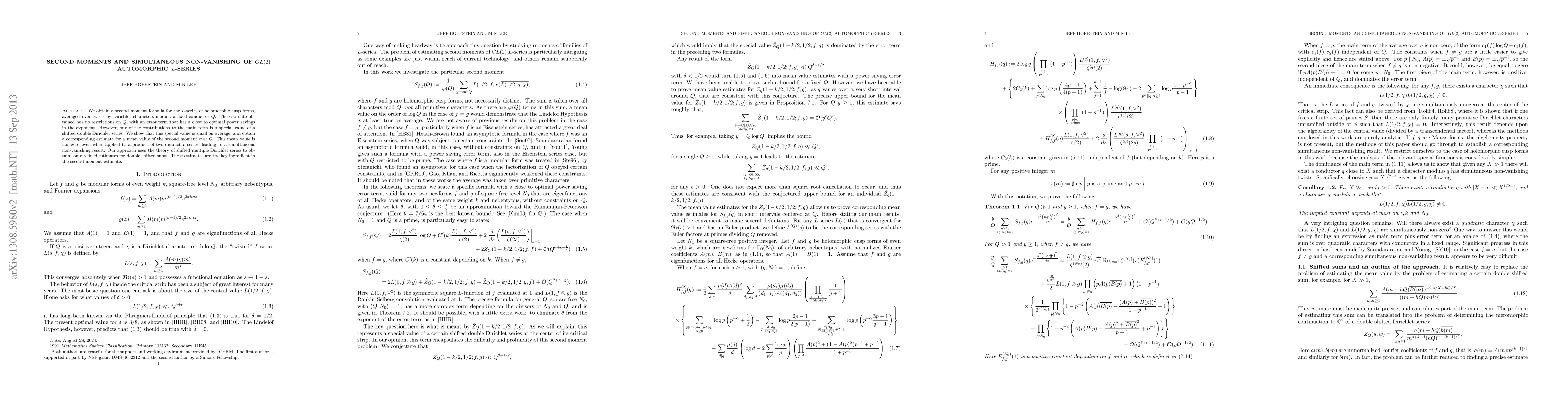 We obtain a second moment formula for the L-series of holomorphic cusp forms, averaged over twists by Dirichlet characters modulo a fixed conductor Q. The estimate obtained has no restrictions on Q, with an error term that has a close to optimal power savings in the exponent. However, one of the contributions to the main term is a special value of a shifted double Dirichlet series. We show that this special value is small on average, and obtain a corresponding estimate for a mean value of the second moment over Q. This mean value is non-zero even when applied to a product of two distinct L-series, leading to a simultaneous non-vanishing result. Our approach uses the theory of shifted multiple Dirichlet series to obtain some refined estimates for double shifted sums. These estimates are the key ingredient in the second moment estimate.