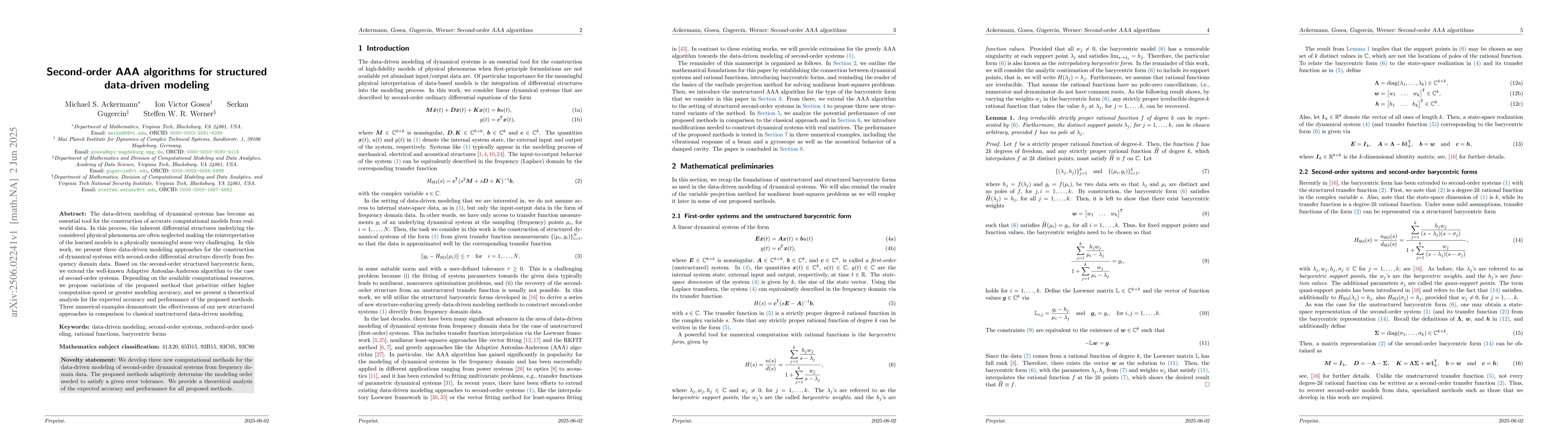 The paper presents three data-driven modeling approaches for constructing dynamical systems with second-order differential structure directly from frequency domain data, extending the Adaptive Antoulas-Anderson algorithm to second-order systems.