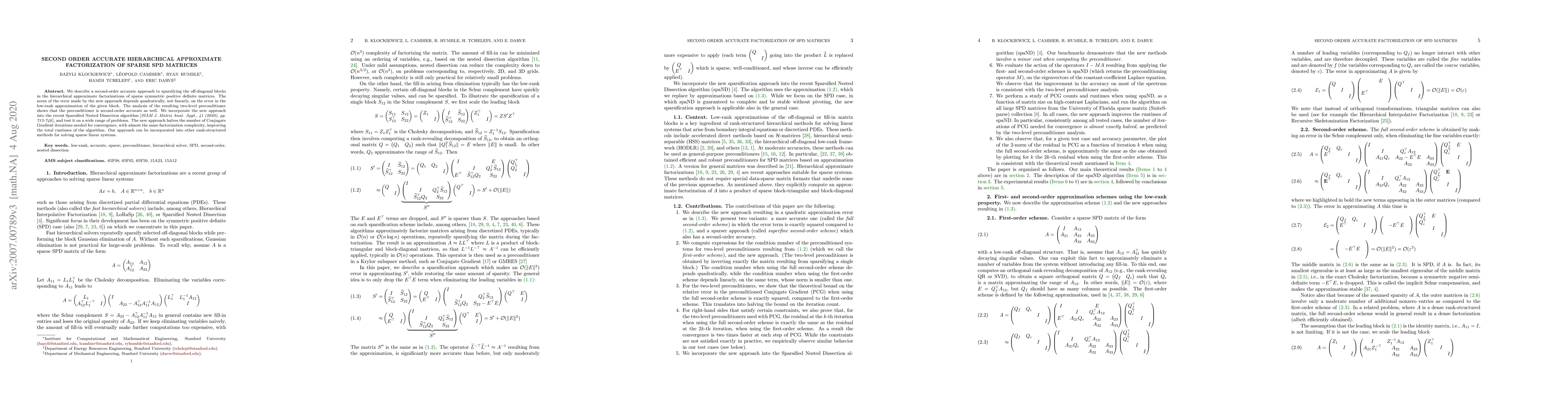 We describe a second-order accurate approach to sparsifying the off-diagonal blocks in the hierarchical approximate factorizations of sparse symmetric positive definite matrices. The norm of the error made by the new approach depends quadratically, not linearly, on the error in the low-rank approximation of the given block. The analysis of the resulting two-level preconditioner shows that the preconditioner is second-order accurate as well. We incorporate the new approach into the recent Sparsified Nested Dissection algorithm [SIAM J. Matrix Anal. Appl., 41 (2020), pp. 715-746], and test it on a wide range of problems. The new approach halves the number of Conjugate Gradient iterations needed for convergence, with almost the same factorization complexity, improving the total runtimes of the algorithm. Our approach can be incorporated into other rank-structured methods for solving sparse linear systems.